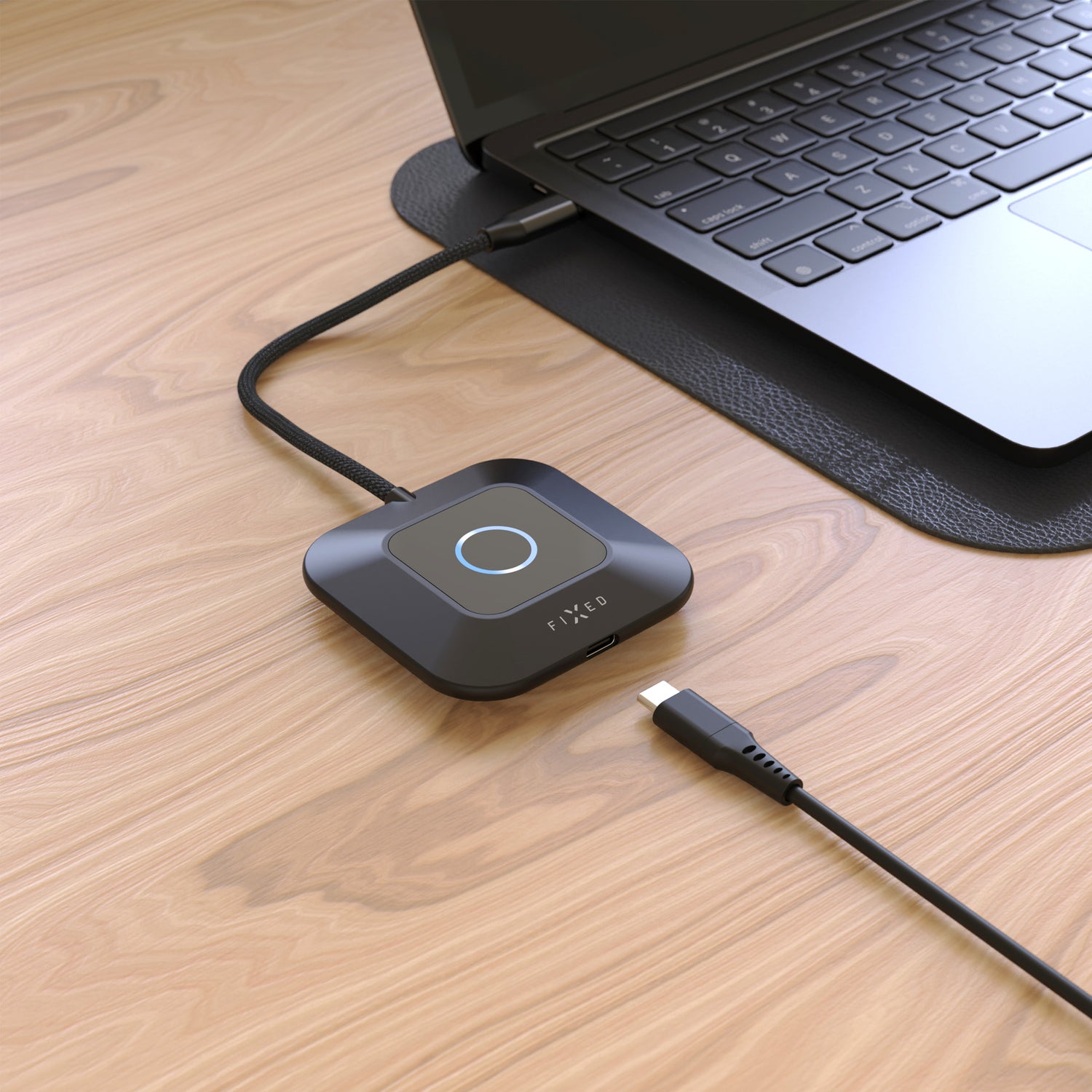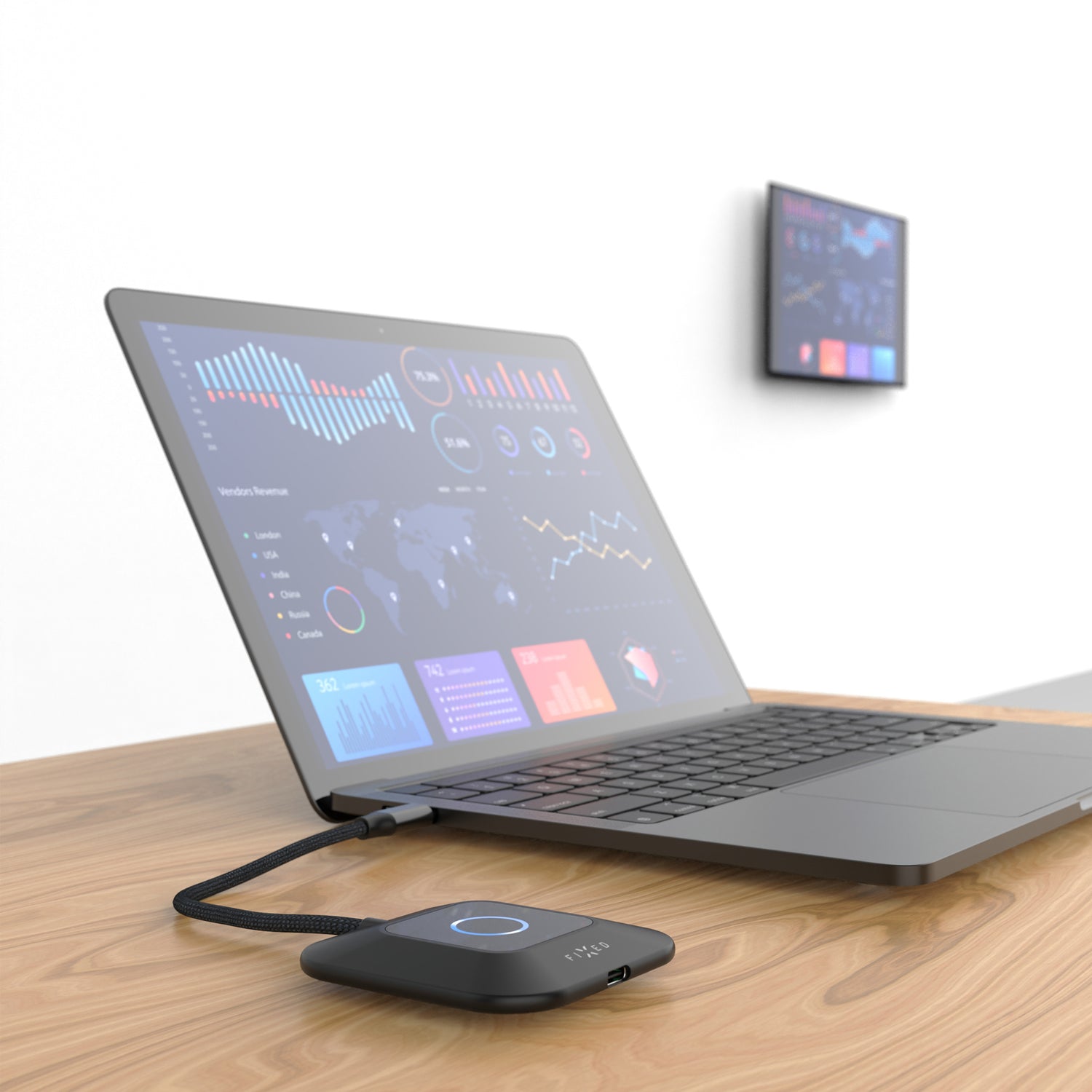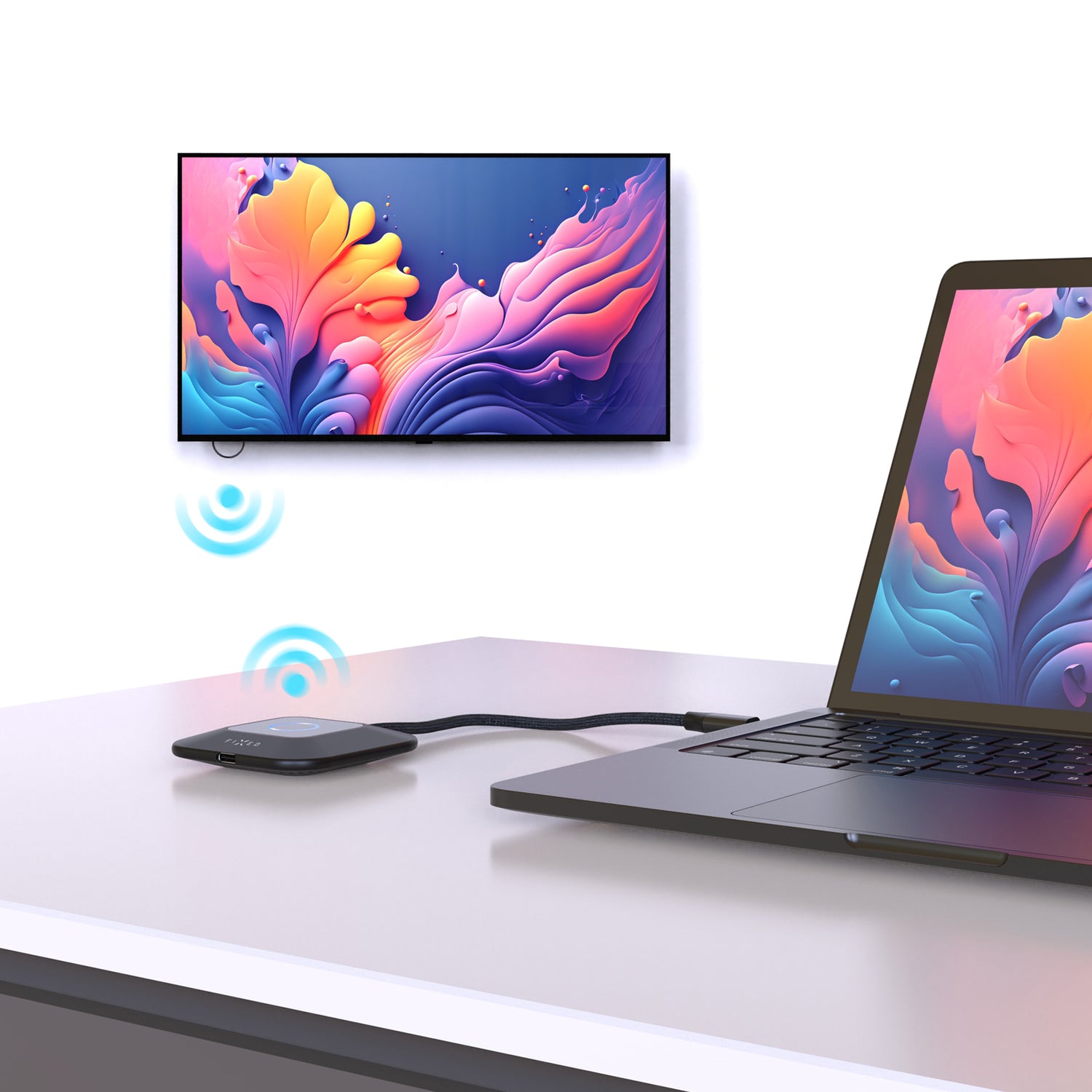 Skládá se ze dvou částí – vysílače s USB-C konektorem, který zapojíte do notebooku nebo telefonu, a přijímacího kabelu s HDMI a USB, který připojíte k televizi, monitoru či projektoru.
