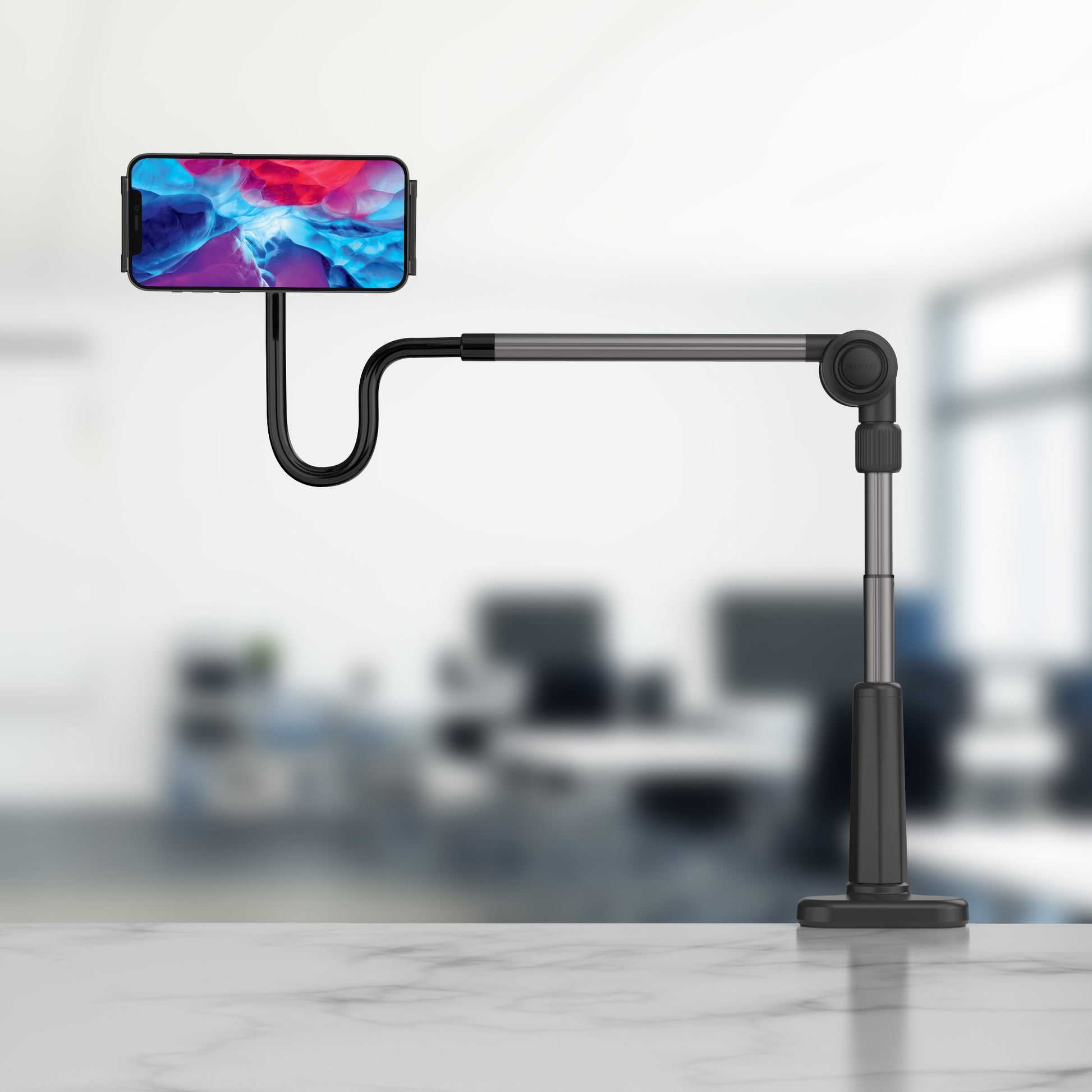 Univerzální stolní a postelový držák pro telefony a tablety 7"–13". Rychloupínací kleště se silikonovou ochranou, flexibilní husí krk, 360° otočná hlava, stabilní uchycení na desku až 7,5cm.