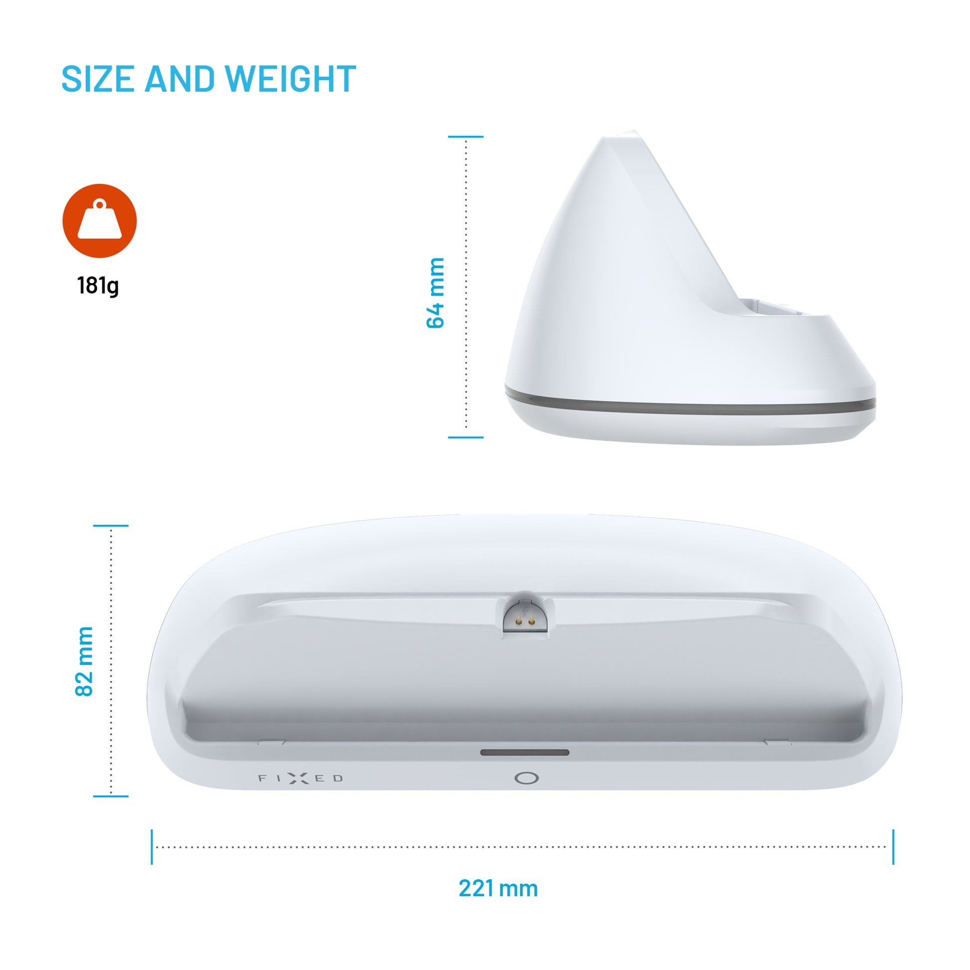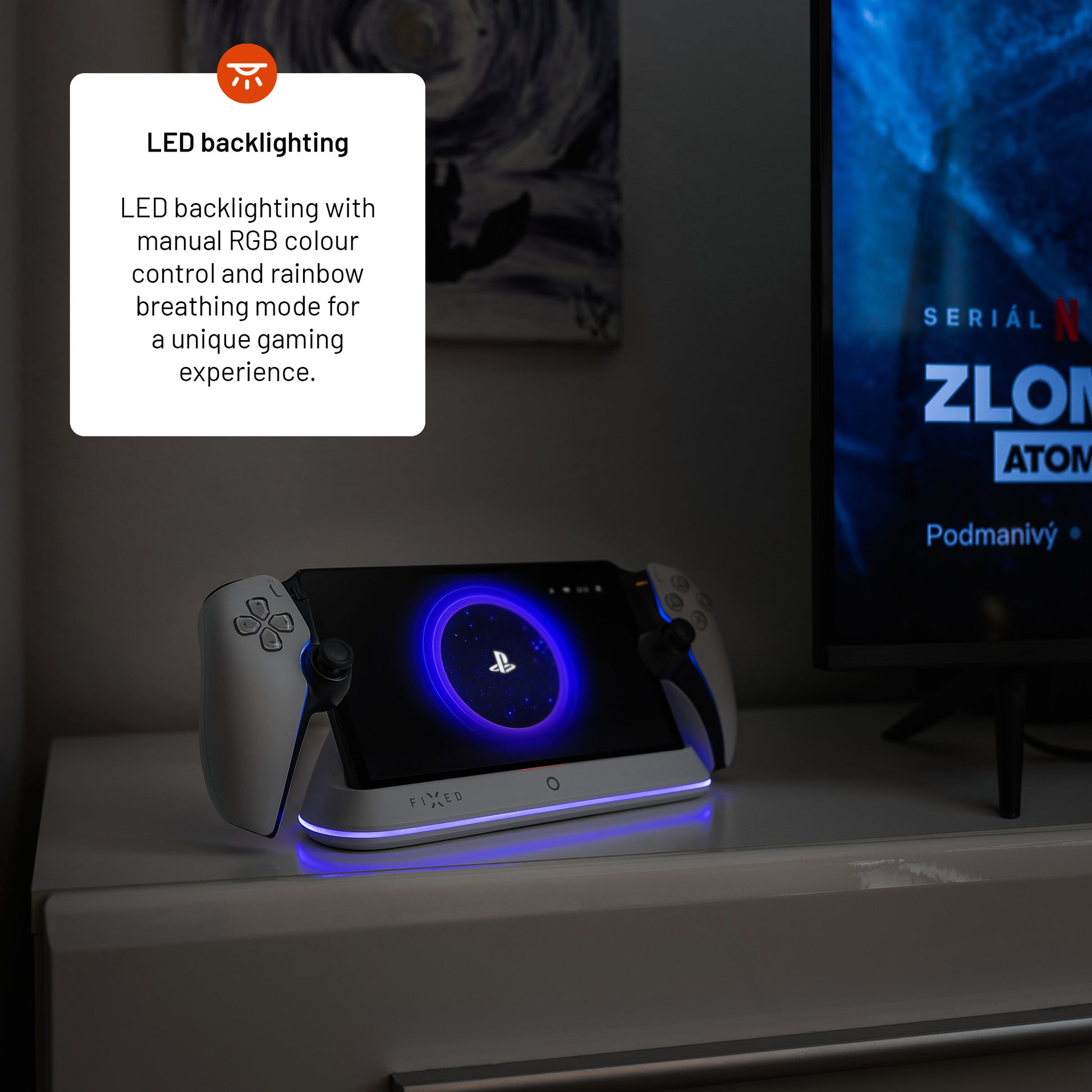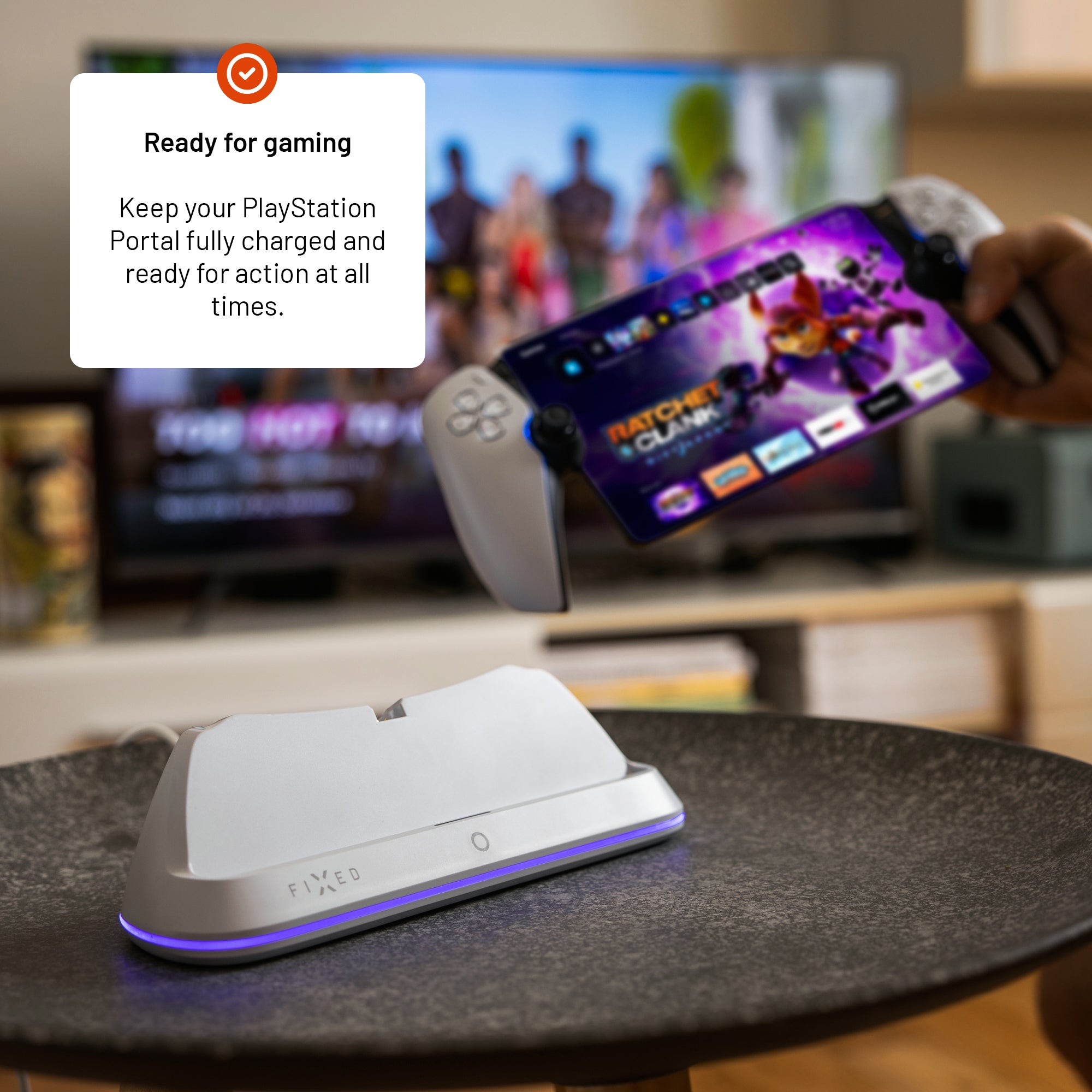 The FIXED charging dock for PlayStation Portal is a stylish and practical solution for conveniently charging your controller. Charging is ensured via a removable USB-C adapter, which you can easily connect to the controller and then just place the device on the stand. Here the adapter immediately connects to the pins and charging starts automatically. You can check the charge status with the LED indicator, so you know immediately when the controller is ready to play again. In addition, the dock enlivens your gaming space with colorful LED backlighting, which you can easily change using the touch button or turn it off completely. Anti-slip pads provide stability and safety for your controller while charging. The station is powered via a USB-C port with a USB-C/USB-A cable included in the package. With the FIXED charging stand, your game controller will always be ready for action, and at the same time it will become a stylish element of your room.