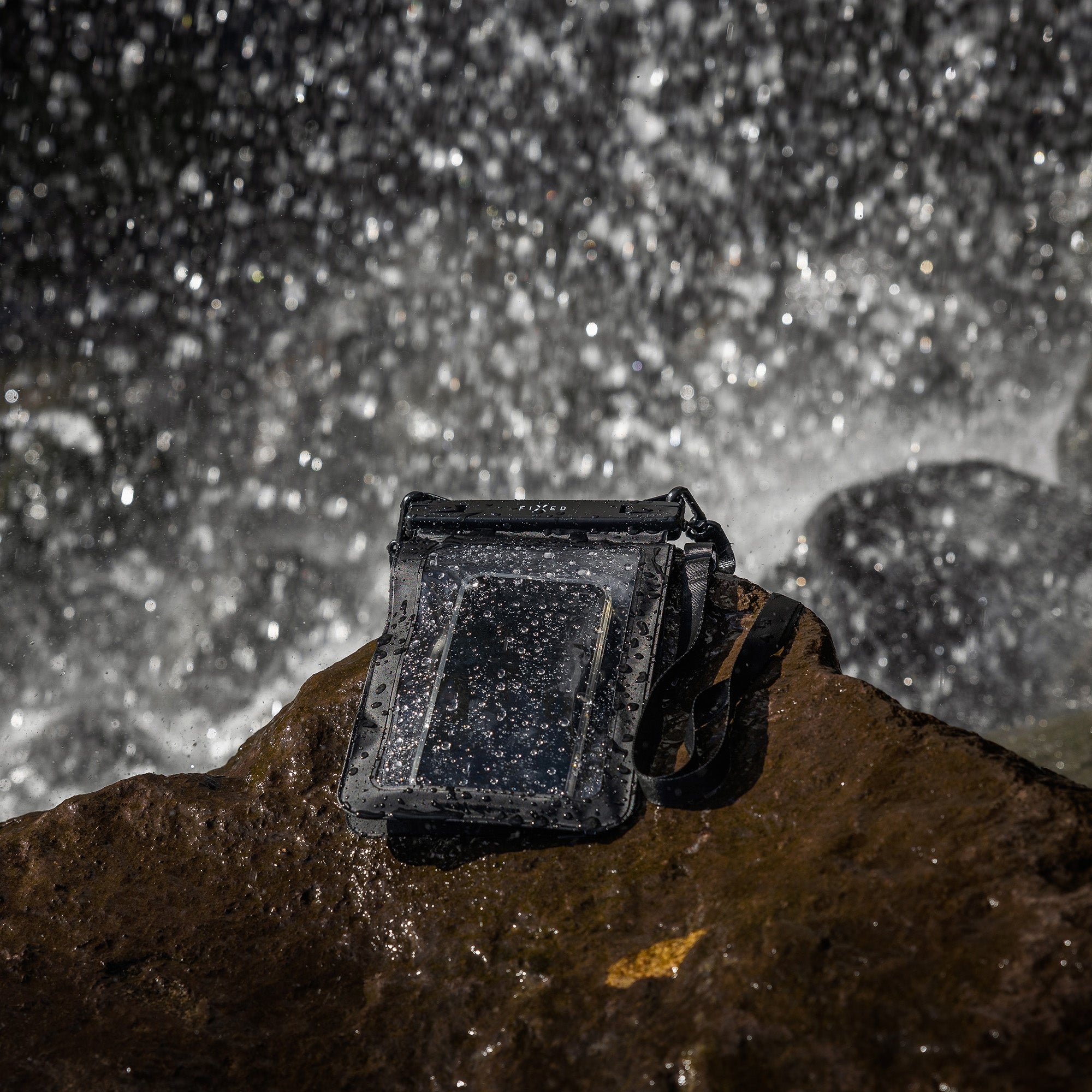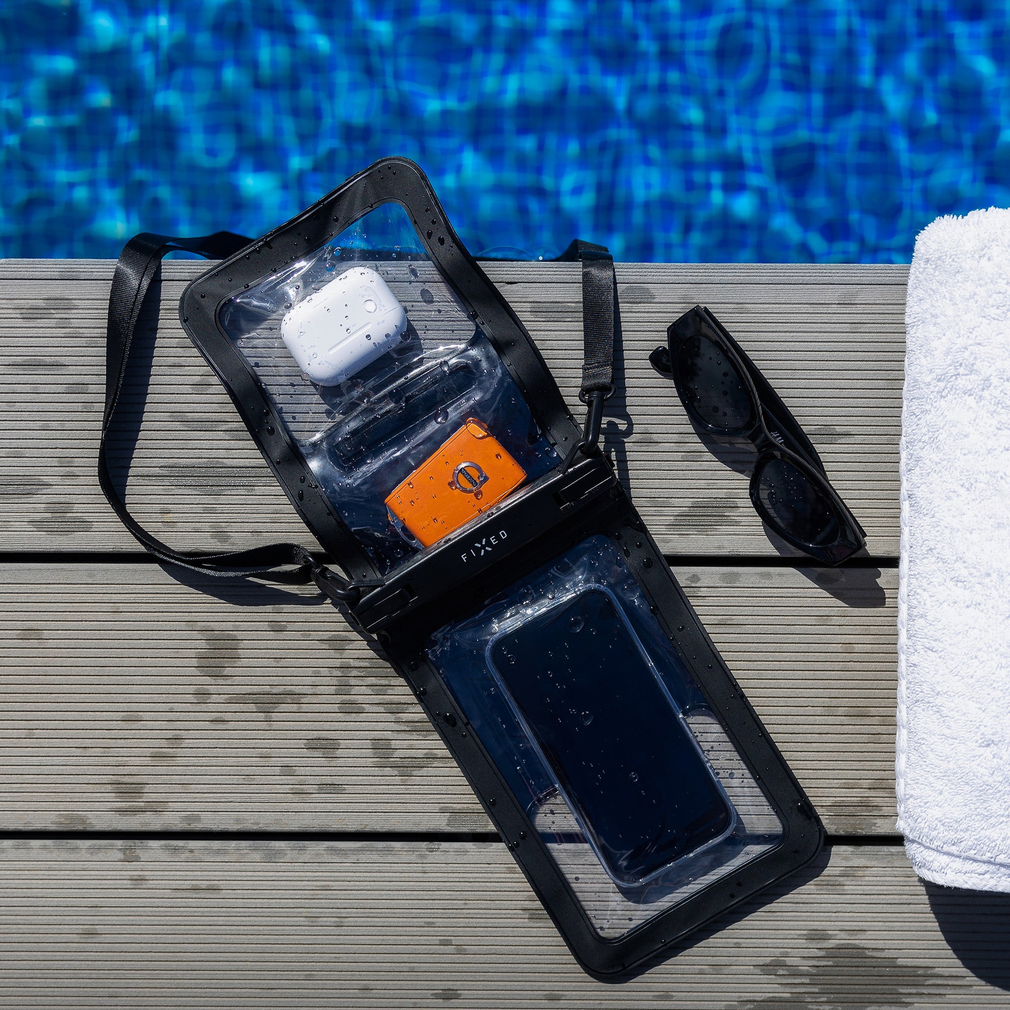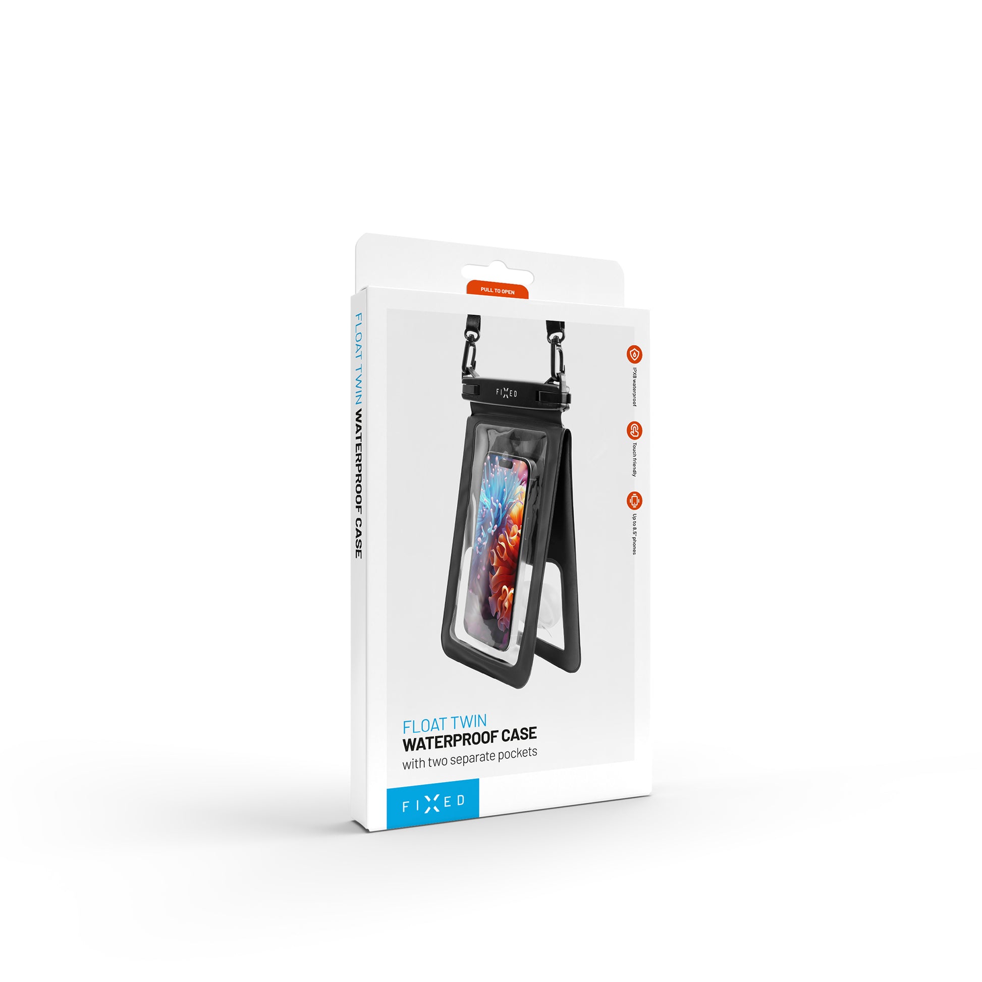 Waterproof case with two pockets and IPX8 certification. Protects your phone and other belongings from water, sand and snow. Transparent touch foil for control and photography, secure closure and strap for variable carrying.