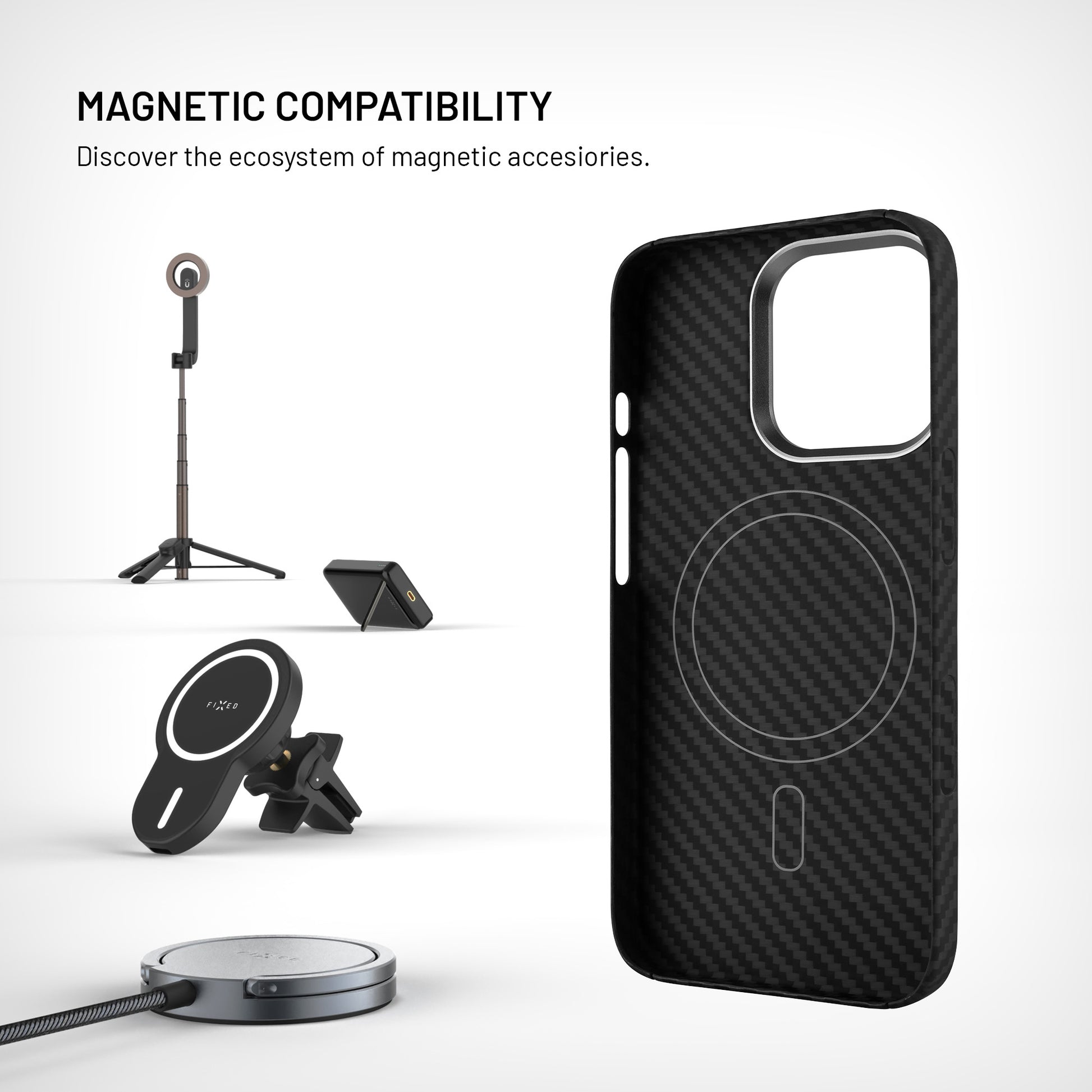 The FIXED MagVelar protective case with MagSafe support combines durability and style. The case is made of aramid fibers, which have the same properties as Kevlar - a material known for its extraordinary strength and durability used in aviation and military applications. It withstands impacts, scratches, high temperatures and extreme conditions, perfectly protecting your phone from everyday wear and tear. Thanks to its ultra-thin and lightweight design, it does not increase the size of the device in any way, while the raised metal frame effectively protects the camera lens. The case is also equipped with MagSafe magnets, which ensure seamless wireless charging and compatibility with other MagSafe accessories. FIXED MagVelar is the ideal choice for anyone looking for maximum protection in a thin and stylish design.