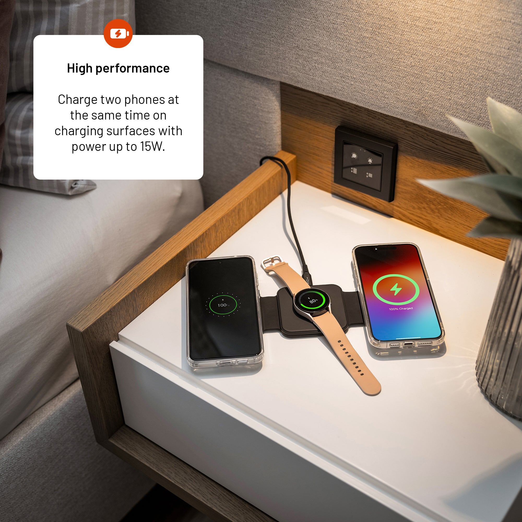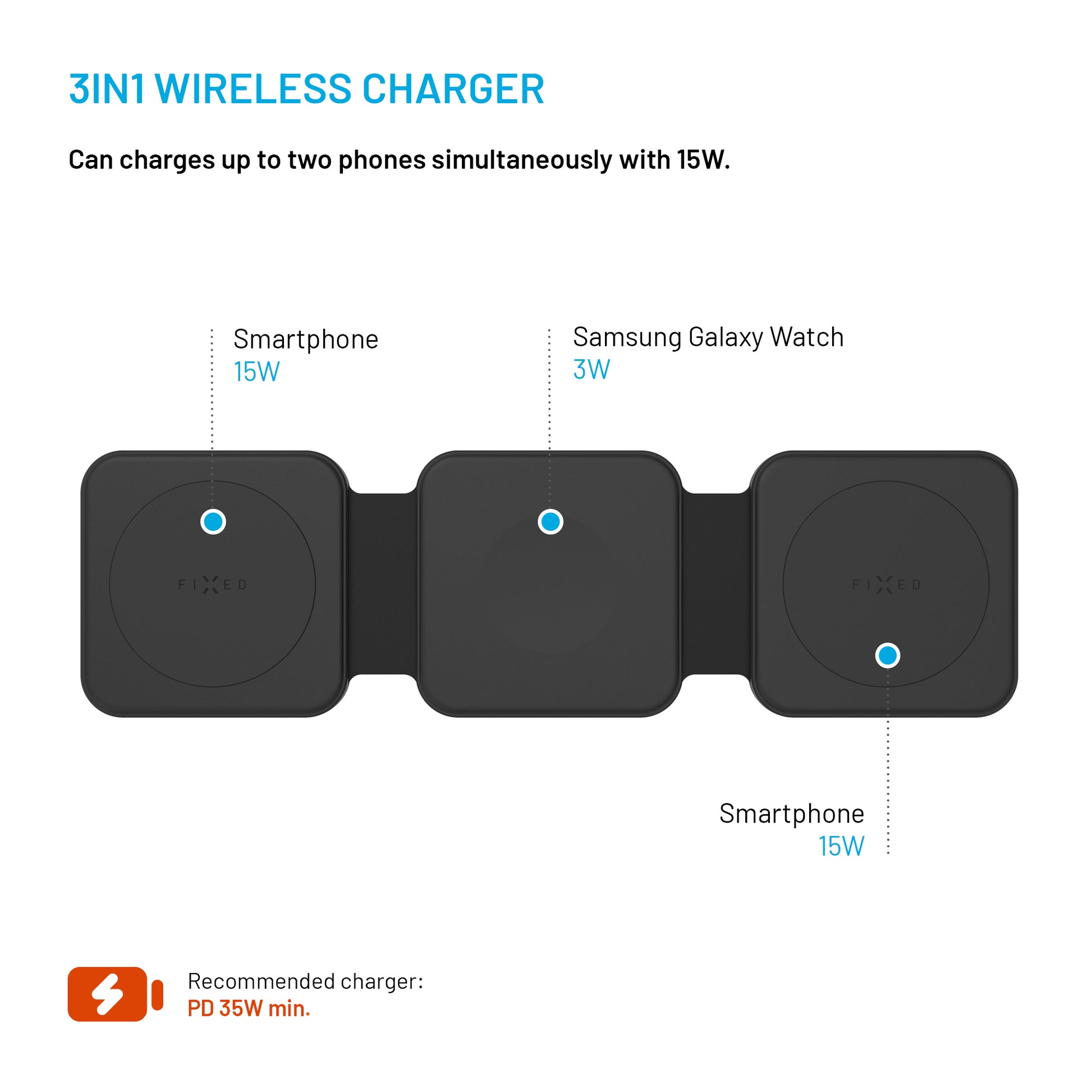 The FIXED wireless charger is a practical solution for quickly charging three devices at the same time. When unfolded, it offers two main surfaces with a high output of up to 15W for fully charging two smartphones at the same time or other devices without compromise. The third surface is an integrated charger designed for the Samsung Galaxy Watch with a power of 3W. The charger stands out not only for its performance, but also for its compact folding design, which you can easily pack into a backpack or purse. Thanks to the built-in magnets, the charger keeps its shape when folded and at the same time allows you to still use the top side as a charging pad. The body of the charger is made of hardened plastic with soft-touch elements that protect the devices being charged from scratches. The charger has a USB-C input connector and requires a power supply of at least 35W in the PD standard for full performance. Enjoy the convenience of wireless charging in a compact design that ensures you always have enough energy at hand.