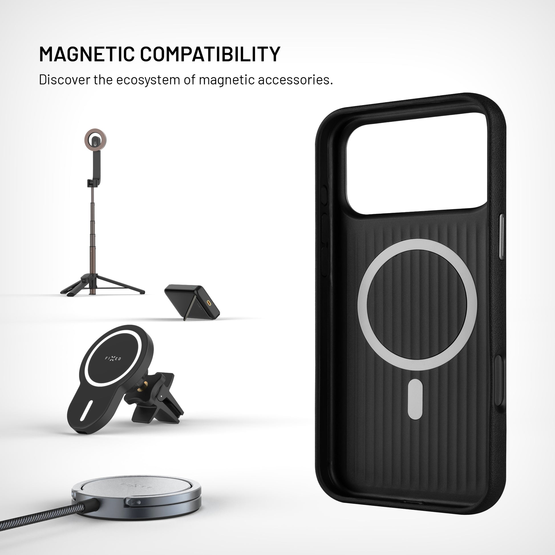 FIXED MagLeather back cover with MagSafe support, made of genuine leather for ultimate protection of your Apple iPhone. The case impresses at first glance with its elegant look of coloured leather combined with metallic button caps and camera cutout edge trim. Over time, each cover acquires a unique and original patina and ages like wine. Thanks to the integrated magnets in the back, the MagLeather cover works perfectly with all MagSafe accessories. The inside of the cover features a soft microfiber lining for perfect security of the inserted phone. FIXED MagLeather is designed precisely to fit the phone model, fits perfectly and feels good in the hand.