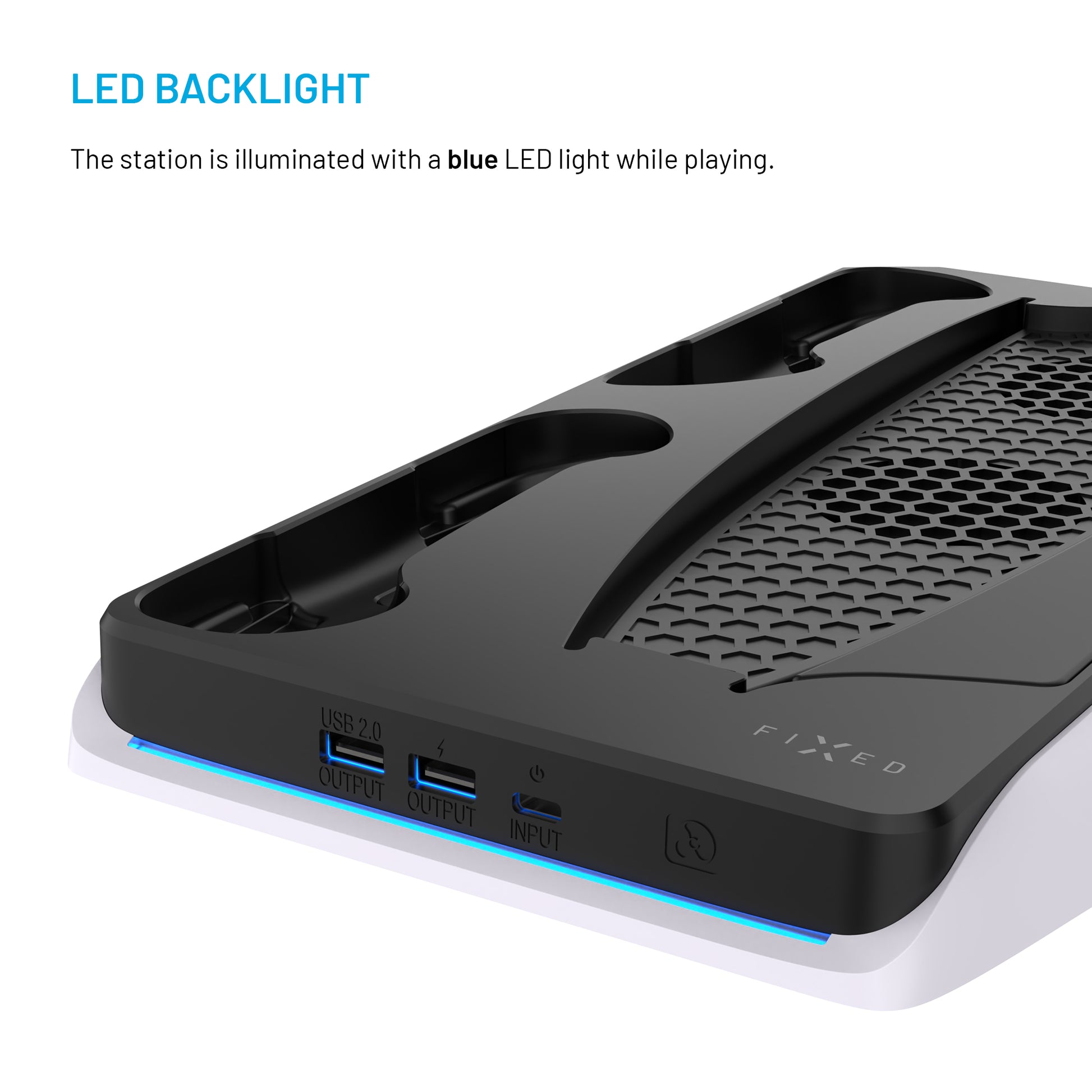 A pair of fans actively cools the console and extends its lifespan. Touch control allows you to easily turn the ventilation on or off, accompanied by a subtle blue backlight - a functional and design detail that sets FIXED apart from ordinary stands.