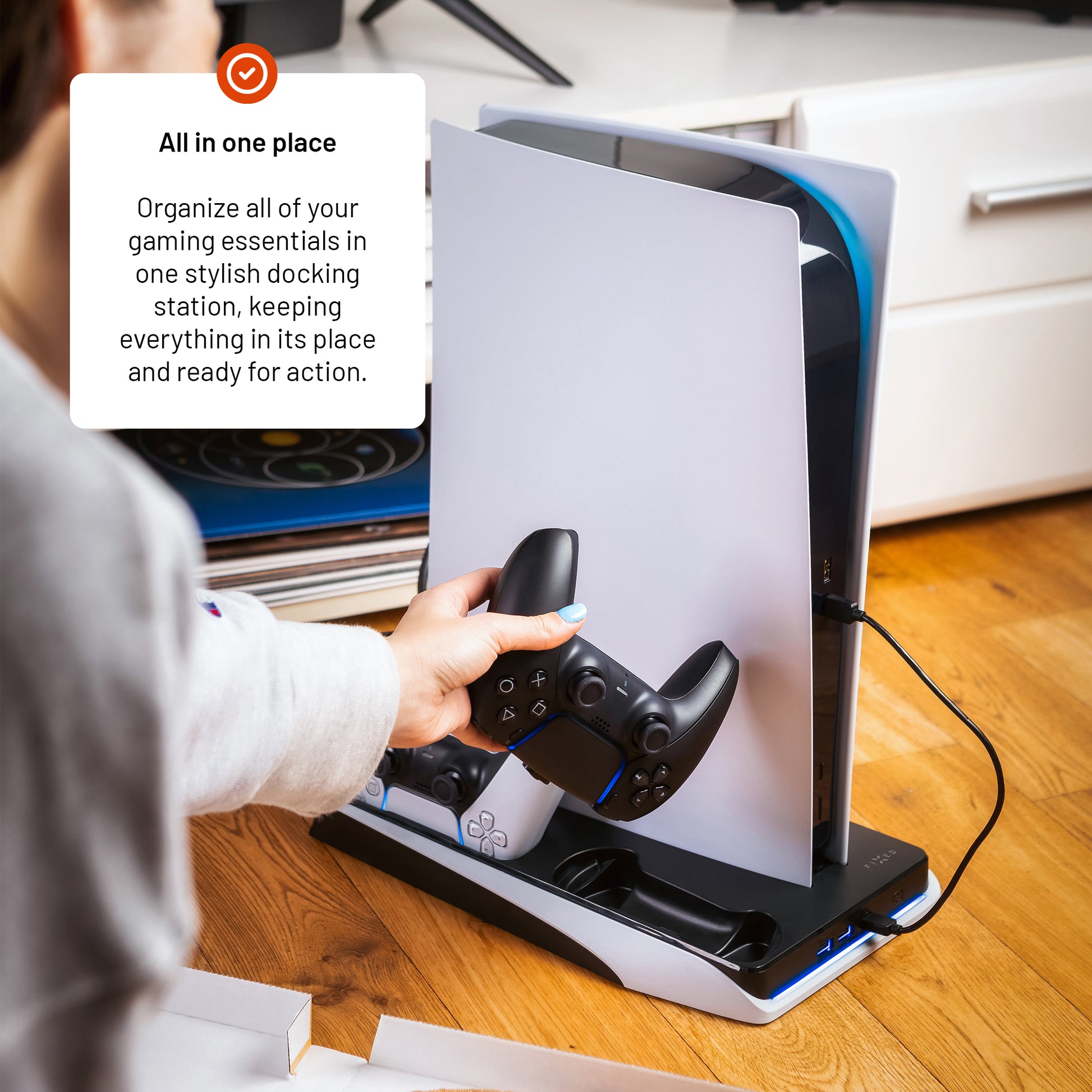 The FIXED station organizes controllers, games, and the console itself in one place. The charging cradles with USB-C adapters can charge both DualSense controllers simultaneously - just click them in and they're ready for your next gaming session.