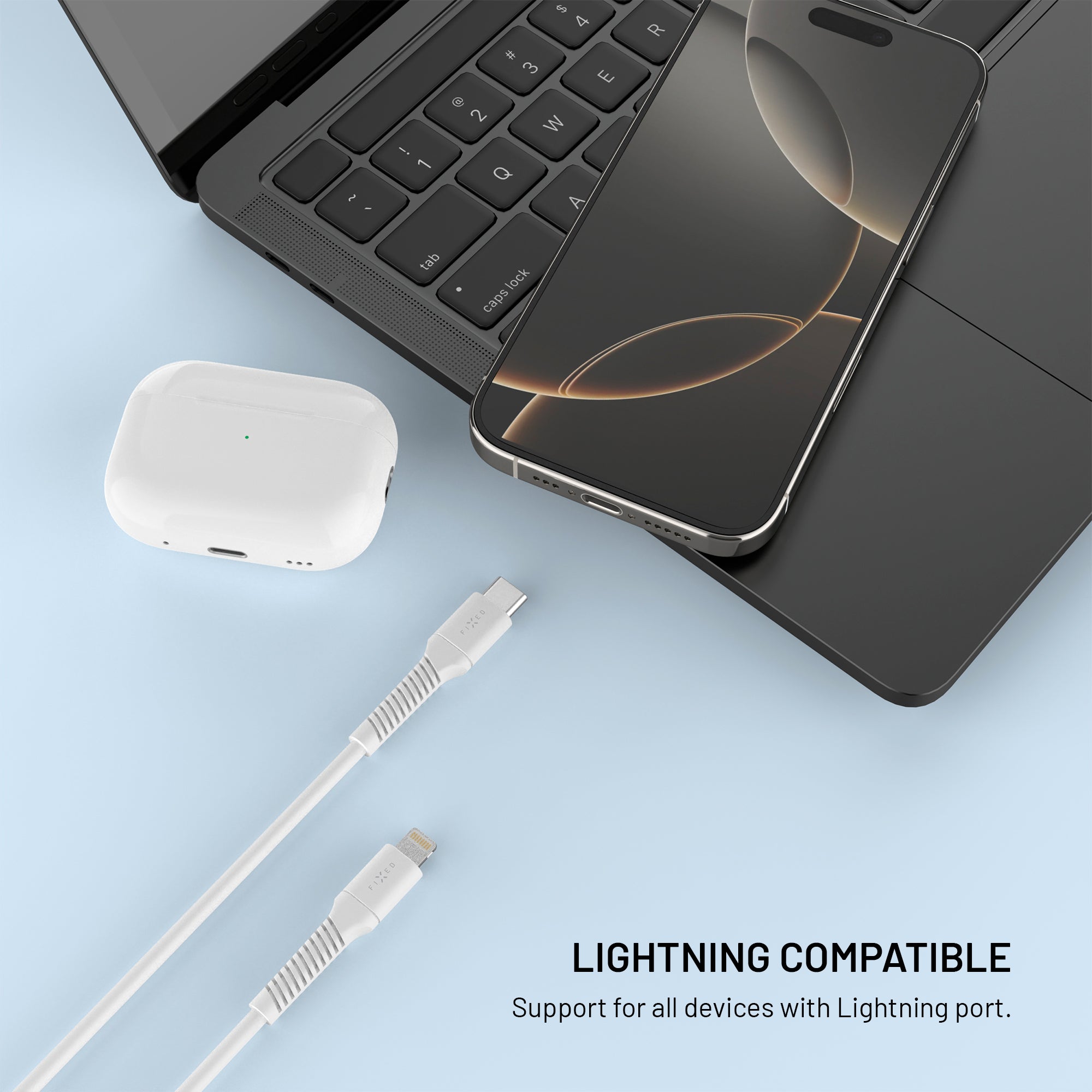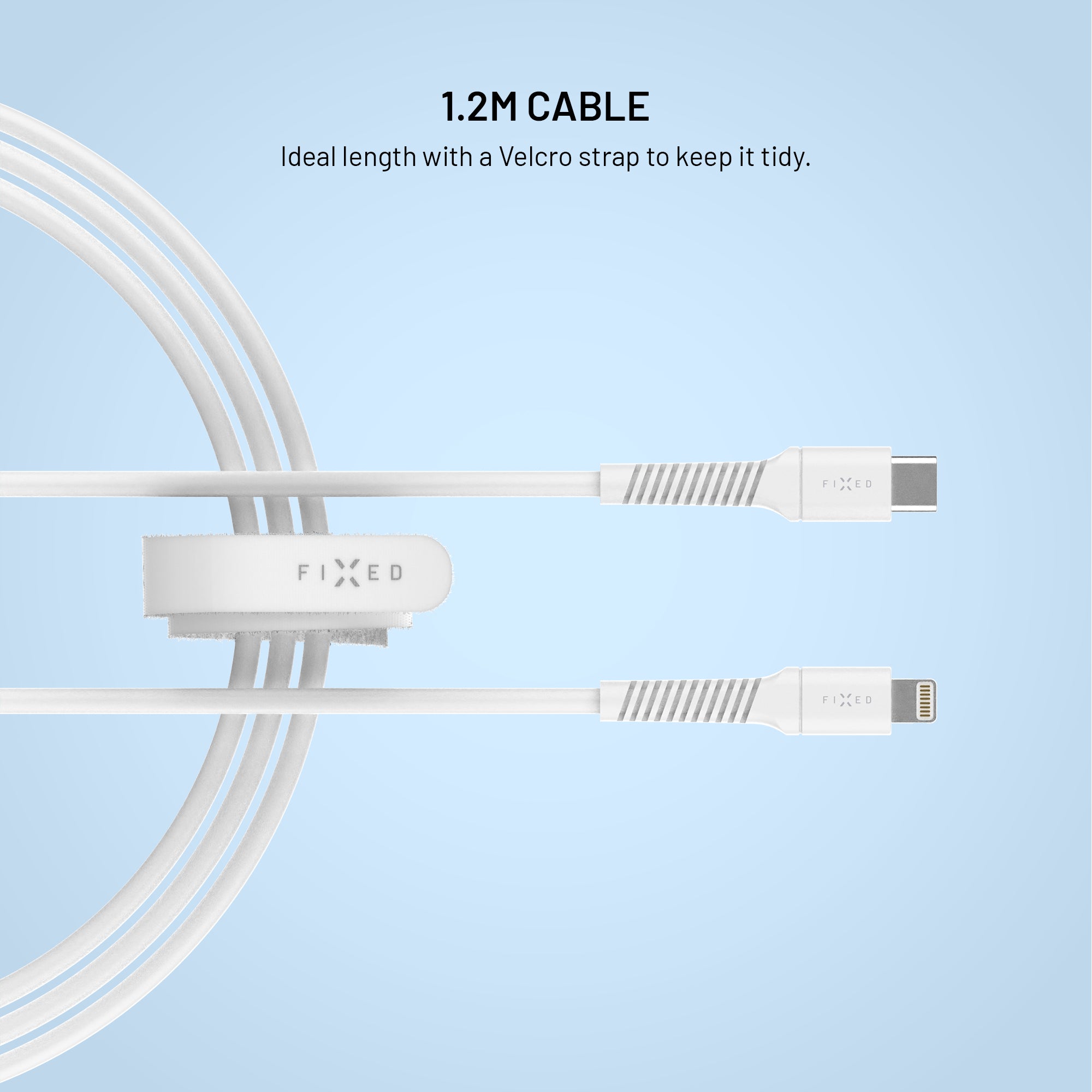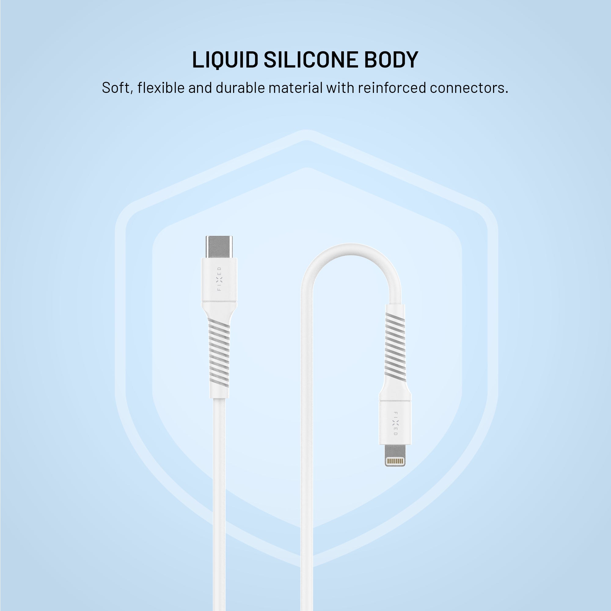 The FIXED Liquid Silicone data and charging cable with USB-C and Lightning connectors is a reliable accessory for your Apple device. It is used to charge your iPhone or iPad with a Lightning connector at maximum speed and performance, while also handling the transfer of music, photos and all data at a speed of 480 Mbps. The cable sheath is made of a special Liquid Silicone material, which is flexible, wear-resistant, pleasant to the touch and does not tangle. The connector ends are also equipped with reinforced ribbing that protects the cable from breaking in stressed areas, allows frequent bending and significantly extends the life of the cable. The package includes a practical cable tie for easy carrying of the cable without tangling.