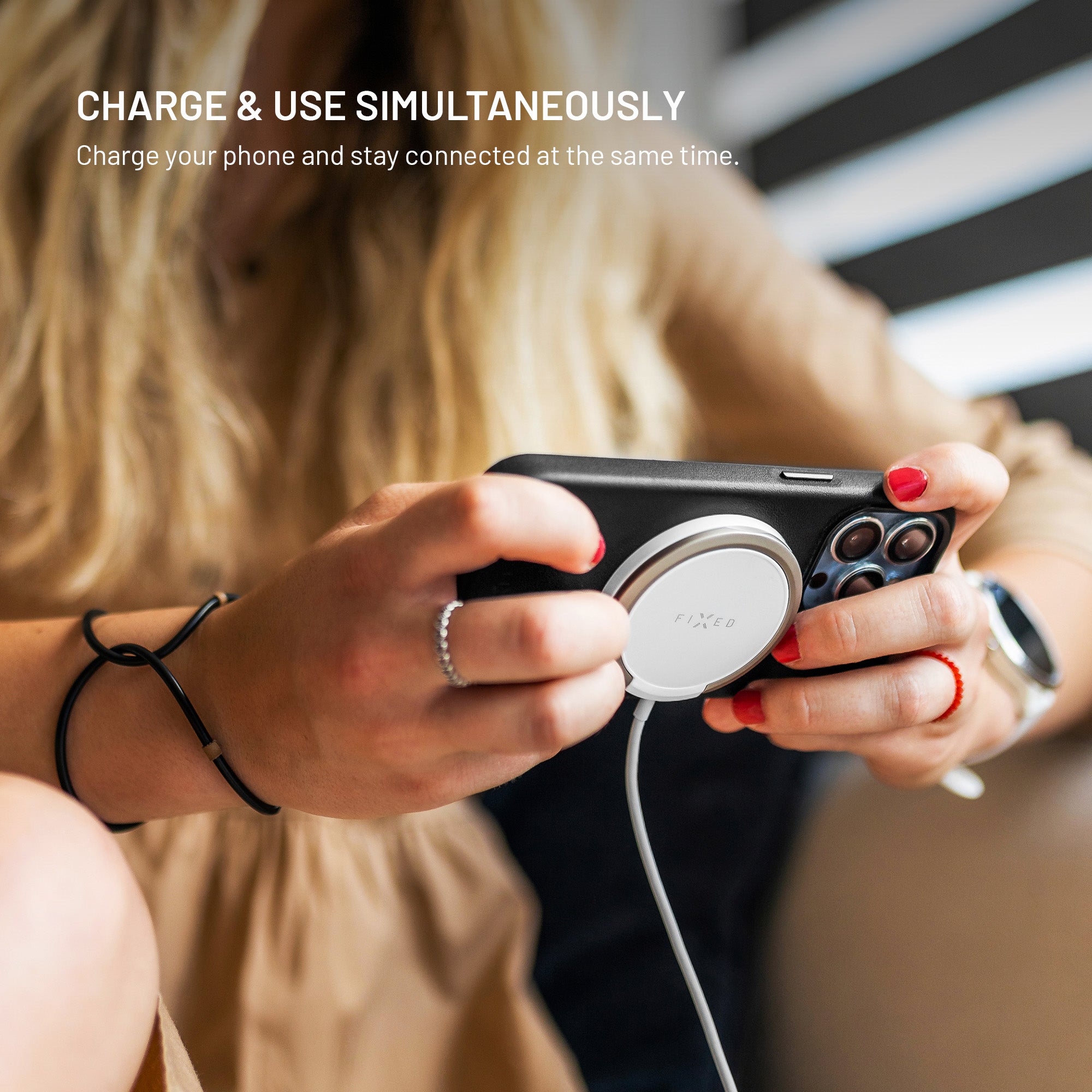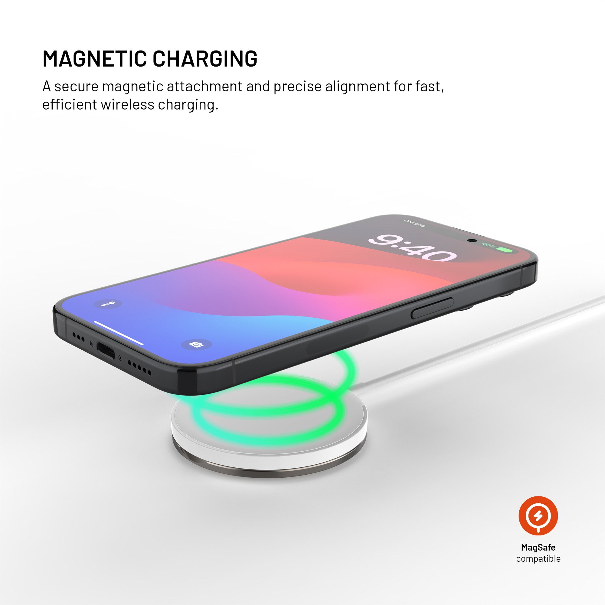 Strong neodymium magnets securely attach the charger to iPhone 12 and later models with MagSafe support. The charger automatically aligns and stays firmly in place even when you move your phone.