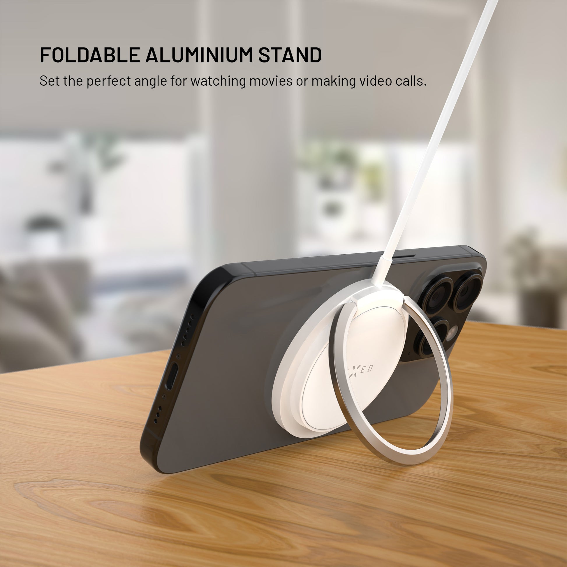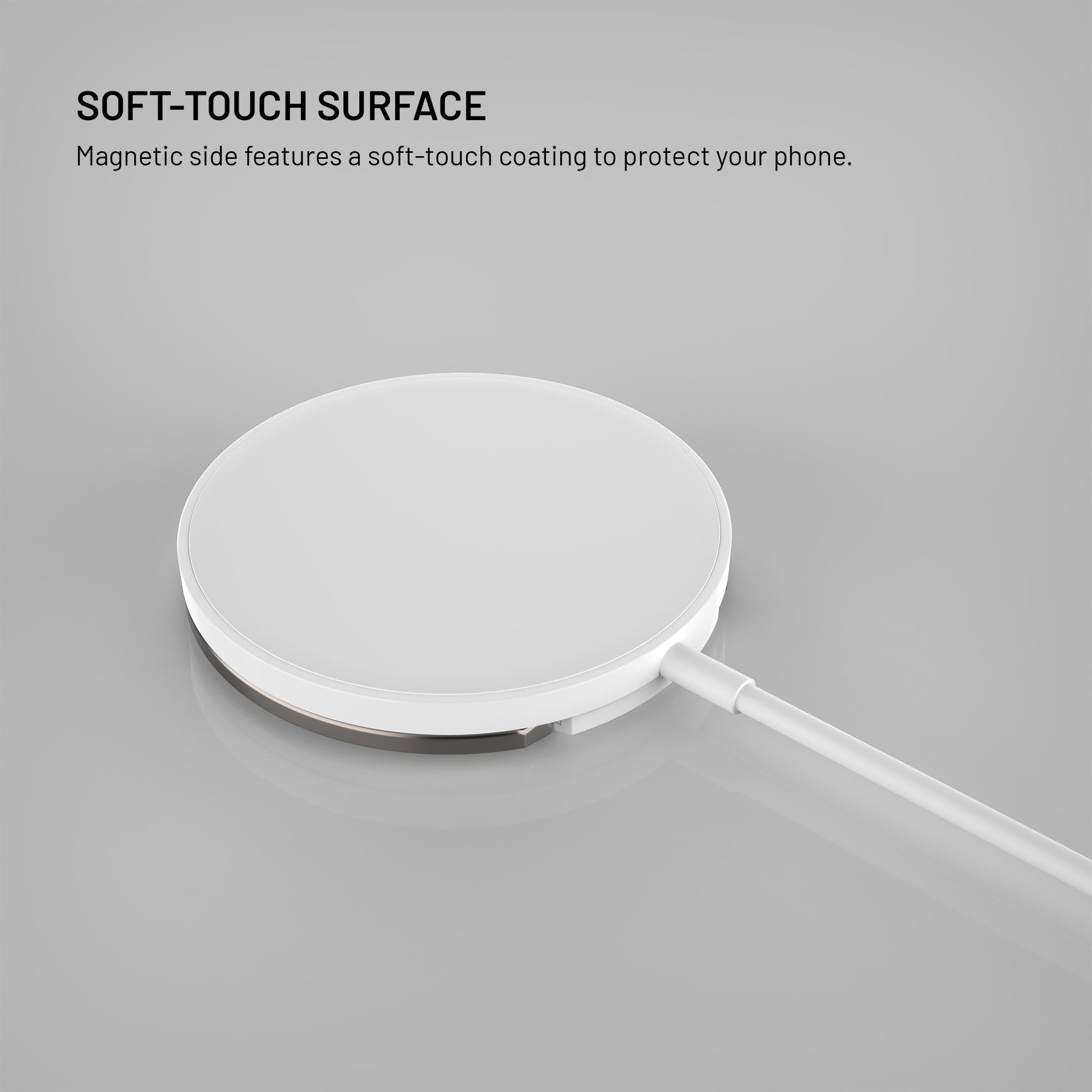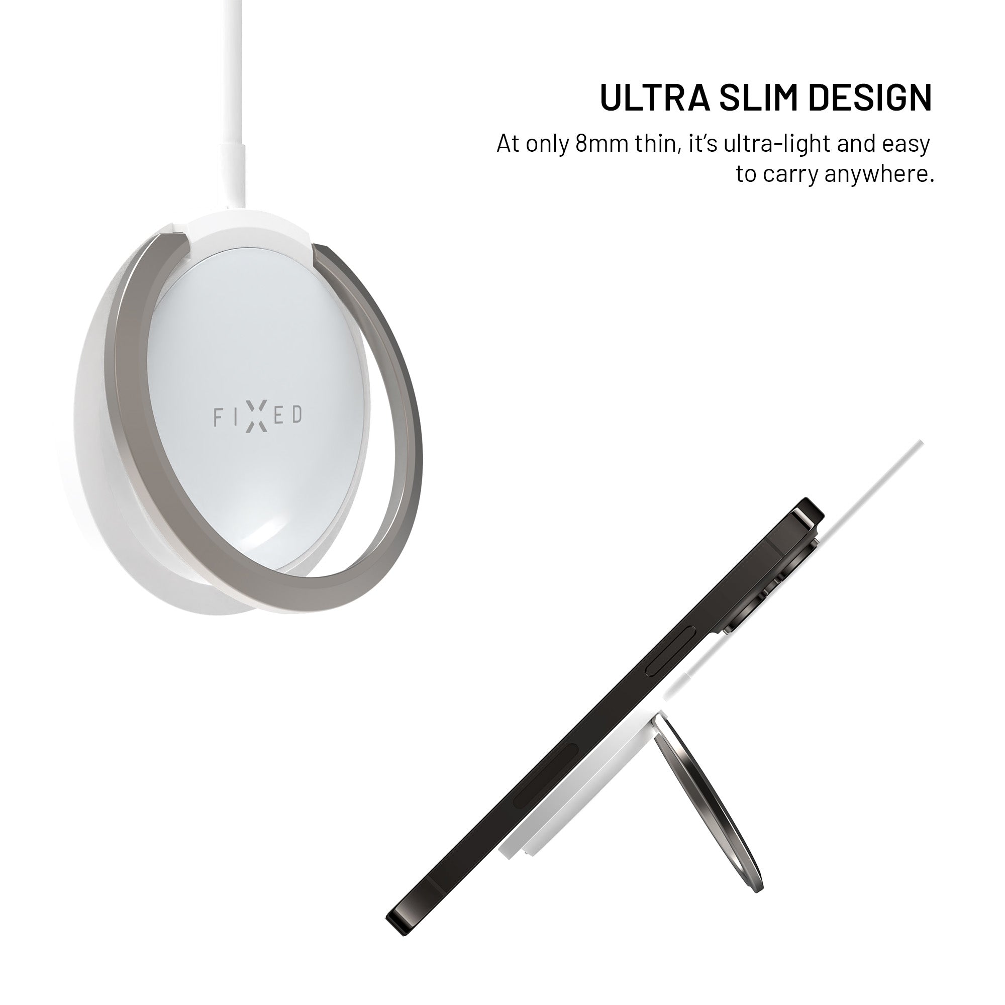 Ultra-slim wireless charger with MagSafe support, up to 15W (7.5W for iOS) and integrated metal stand for convenient charging and viewing. Secure magnetic attachment, soft silicone surface and 1.2m USB-C cable.