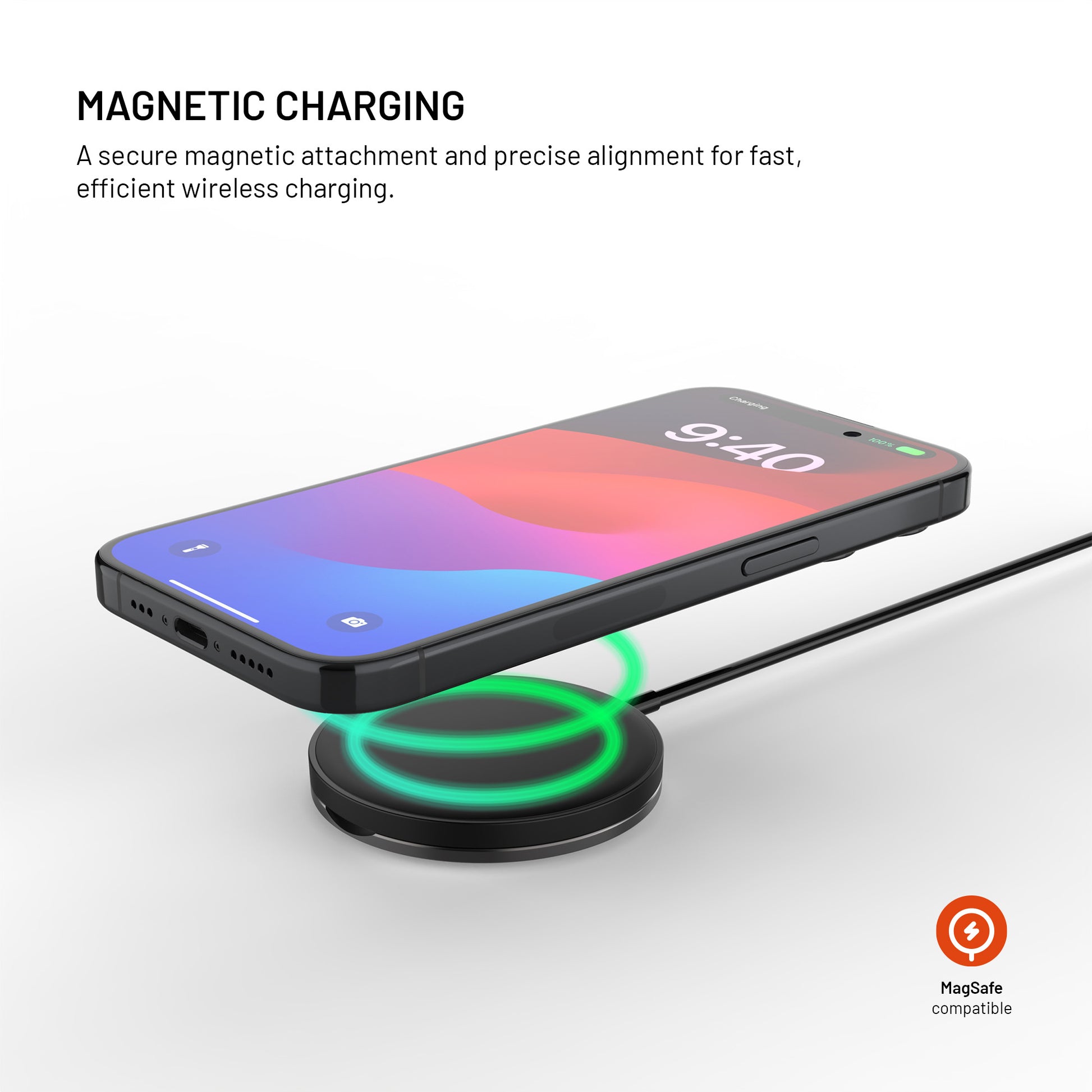 Strong neodymium magnets securely attach the charger to iPhone 12 and later models with MagSafe support. The charger automatically aligns and stays firmly in place even when you move your phone.