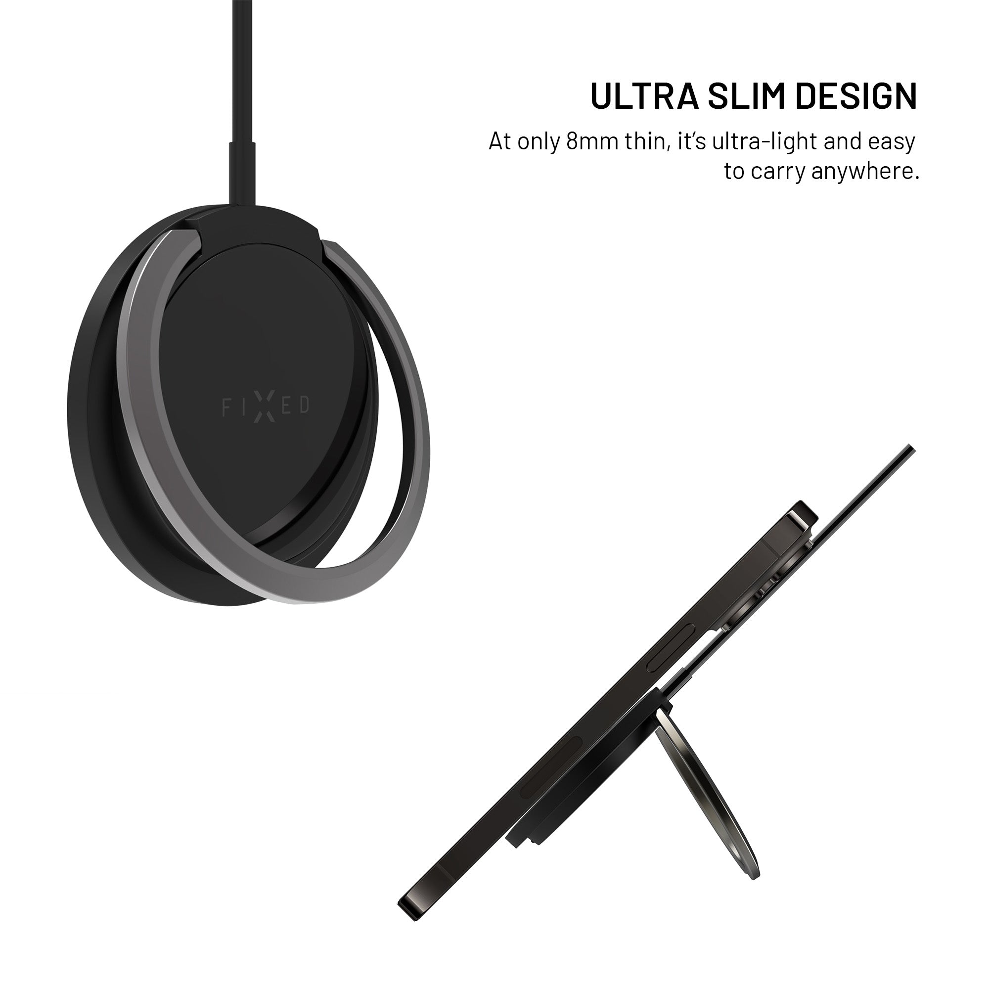 Ultra-slim wireless charger with MagSafe support, up to 15W (7.5W for iOS) and integrated metal stand for convenient charging and viewing. Secure magnetic attachment, soft silicone surface and 1.2m USB-C cable.