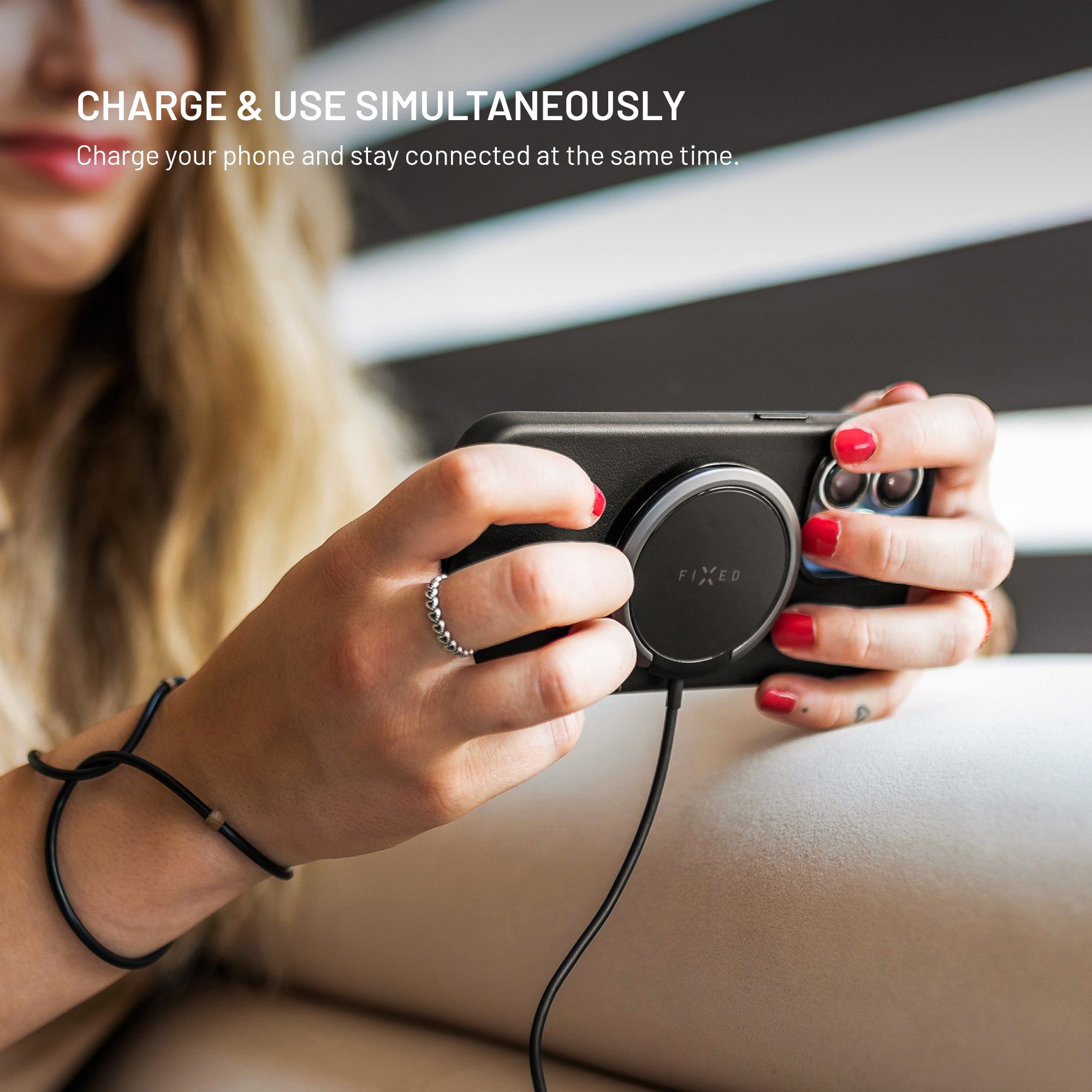 The body is only 8 mm thin, blends perfectly with your phone and does not take up space in your pocket. The soft silicone surface protects the back of the device from scratches. With an integrated 1.2 m USB-C cable, it is ready for everyday use and travel.