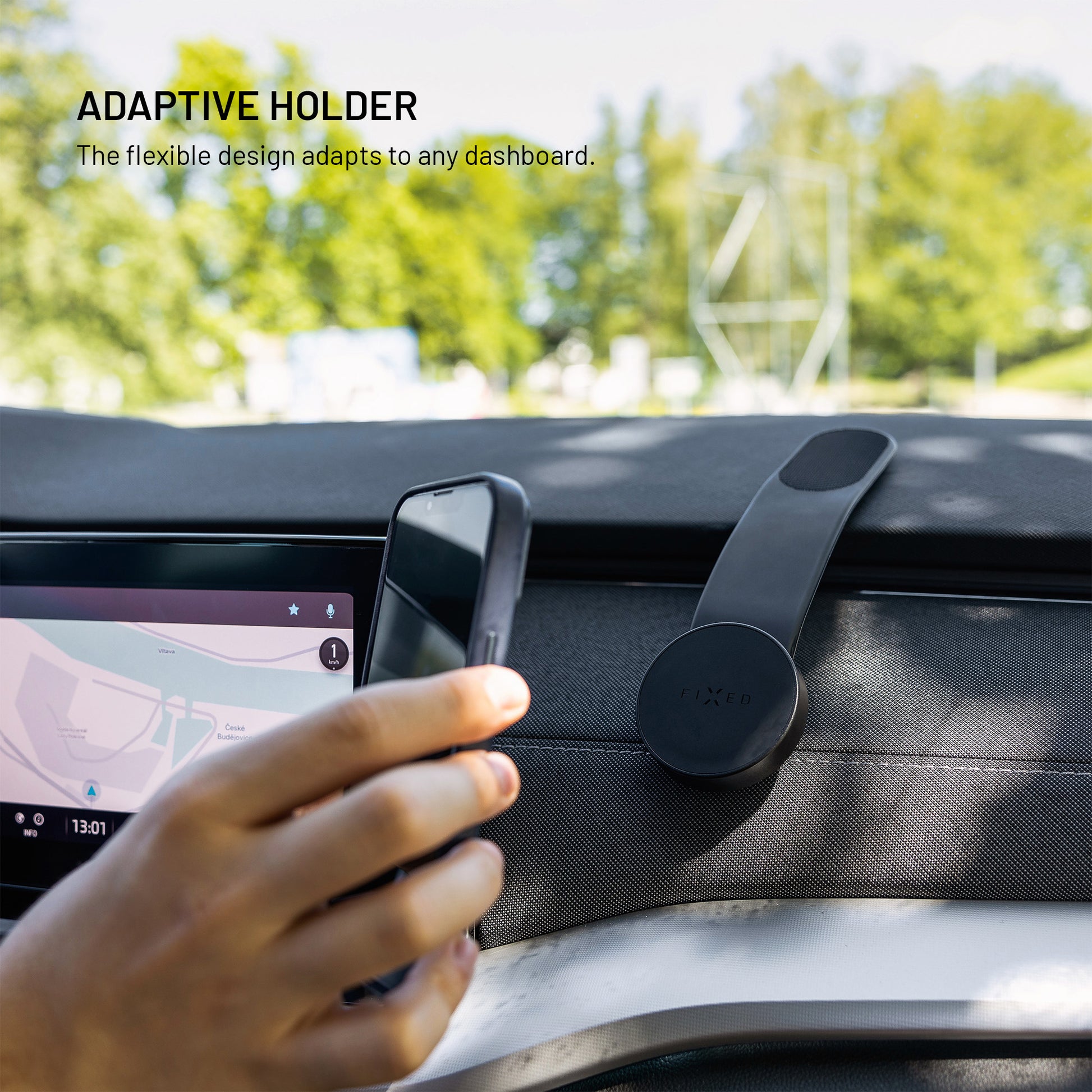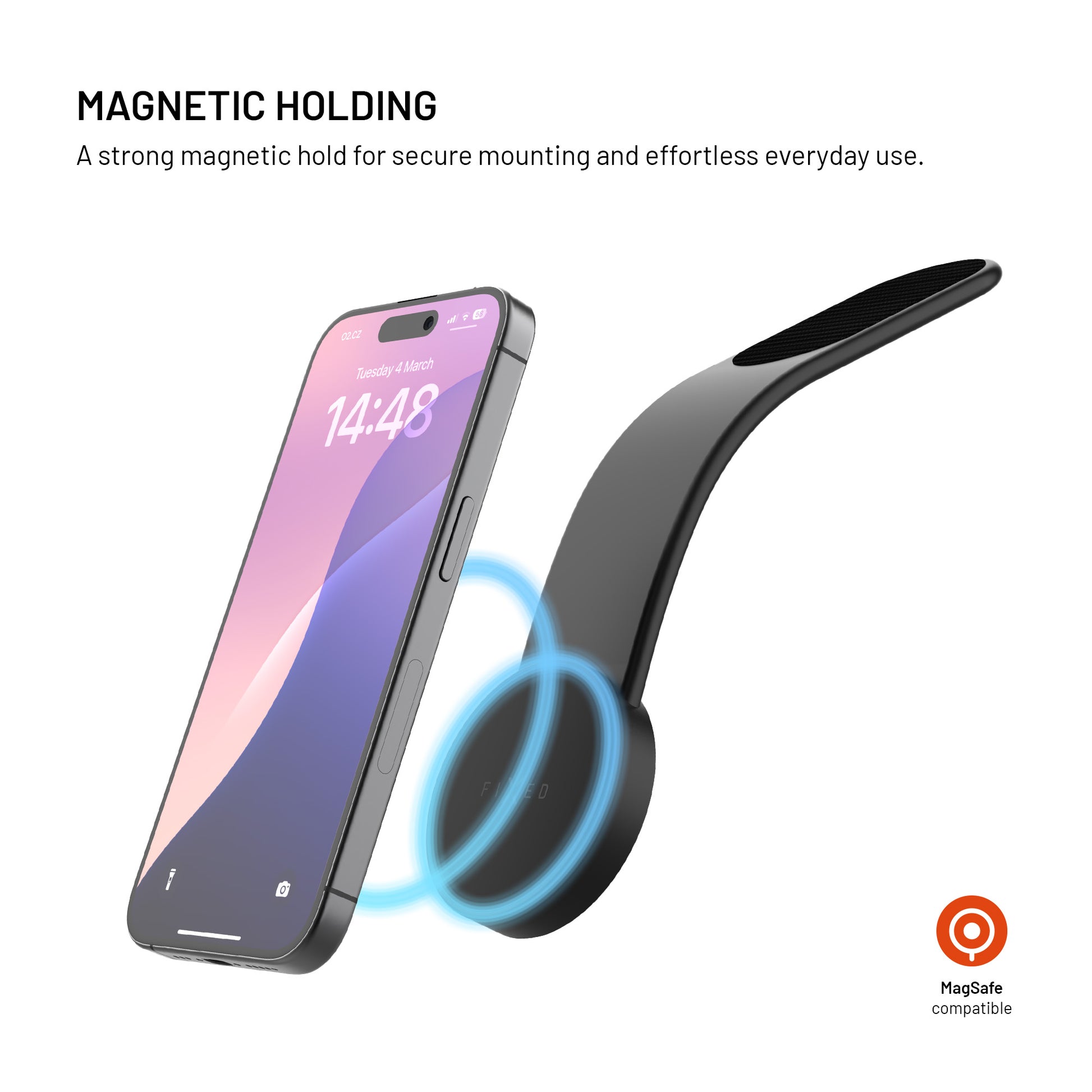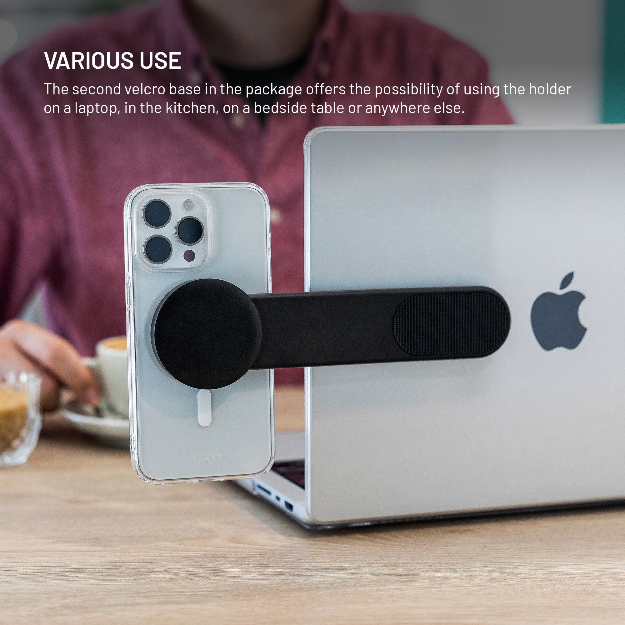 Flexible holder with MagSafe magnets with universal attachment using Velcro with 3M tape. Flexible arm for adjusting the ideal angle in the car, at home and in the office. Included magnetic ring for phones without MagSafe.