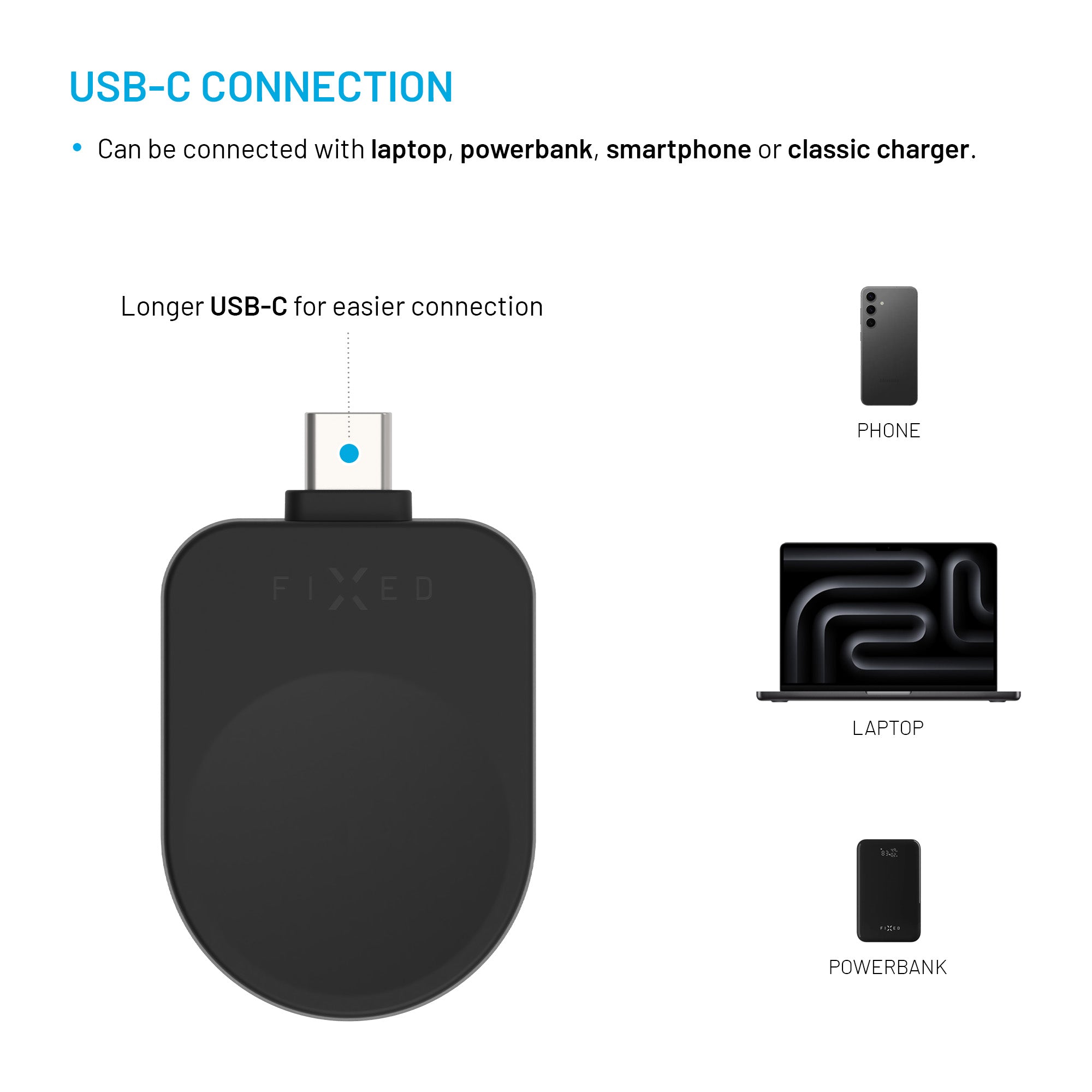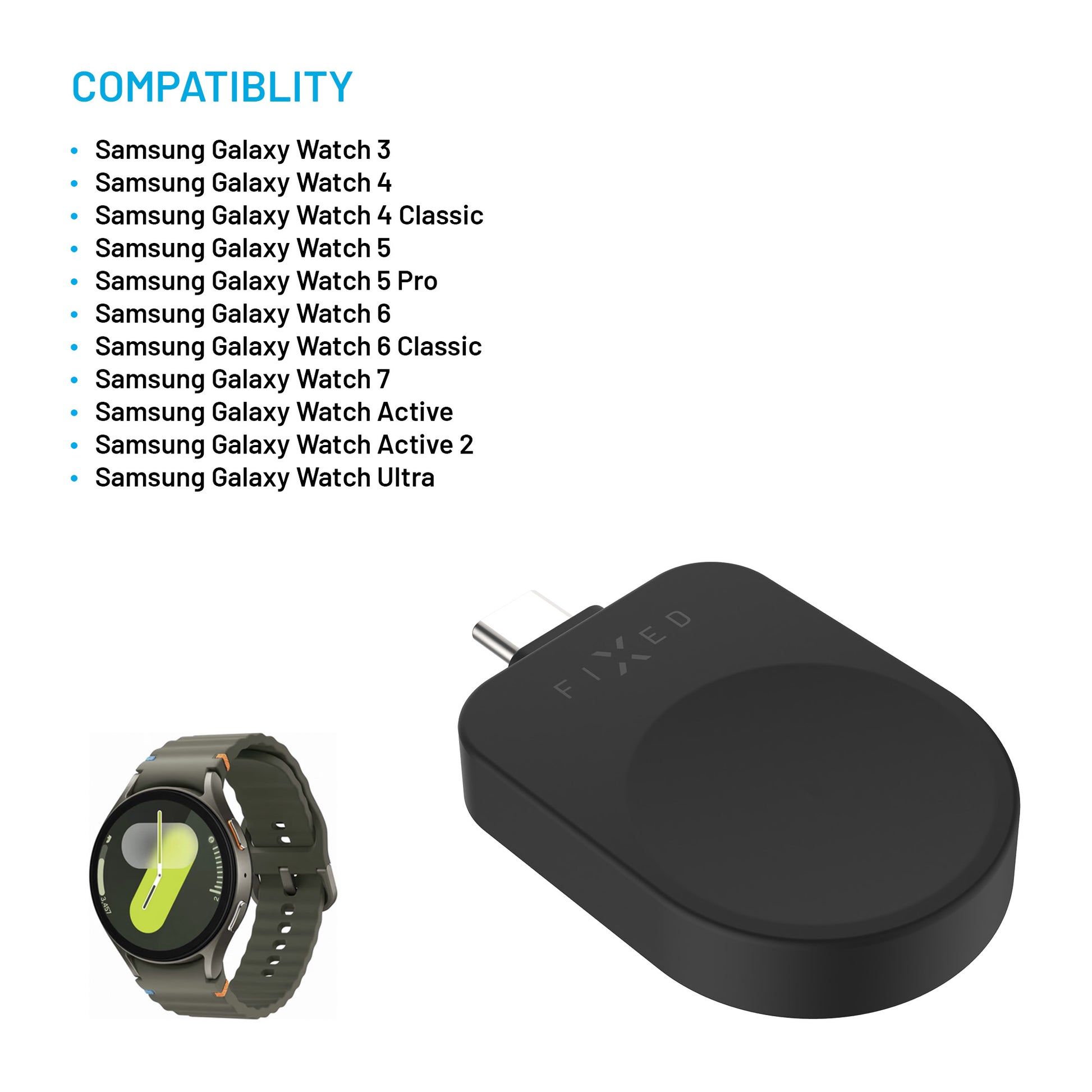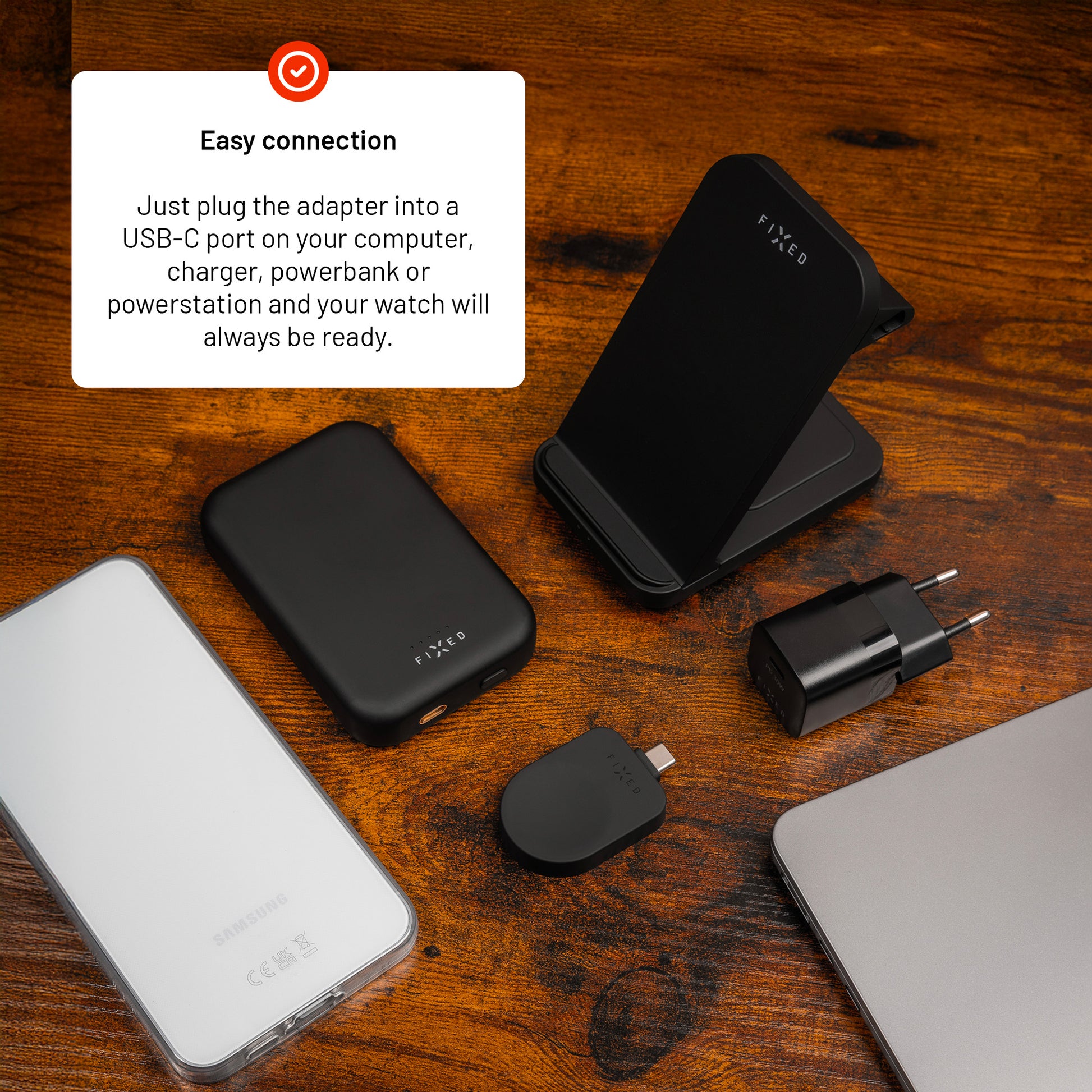 The compact charging adapter for Samsung Galaxy Watch is the ideal solution for quick and convenient energy replenishment anytime, anywhere. Thanks to the extended USB-C connector, you can easily connect it to the FIXED Powerstation Uni charging station, laptop, phone or other compatible device. Just place the watch on it and charging will start immediately. A practical accessory that you will appreciate on the go and in everyday use.