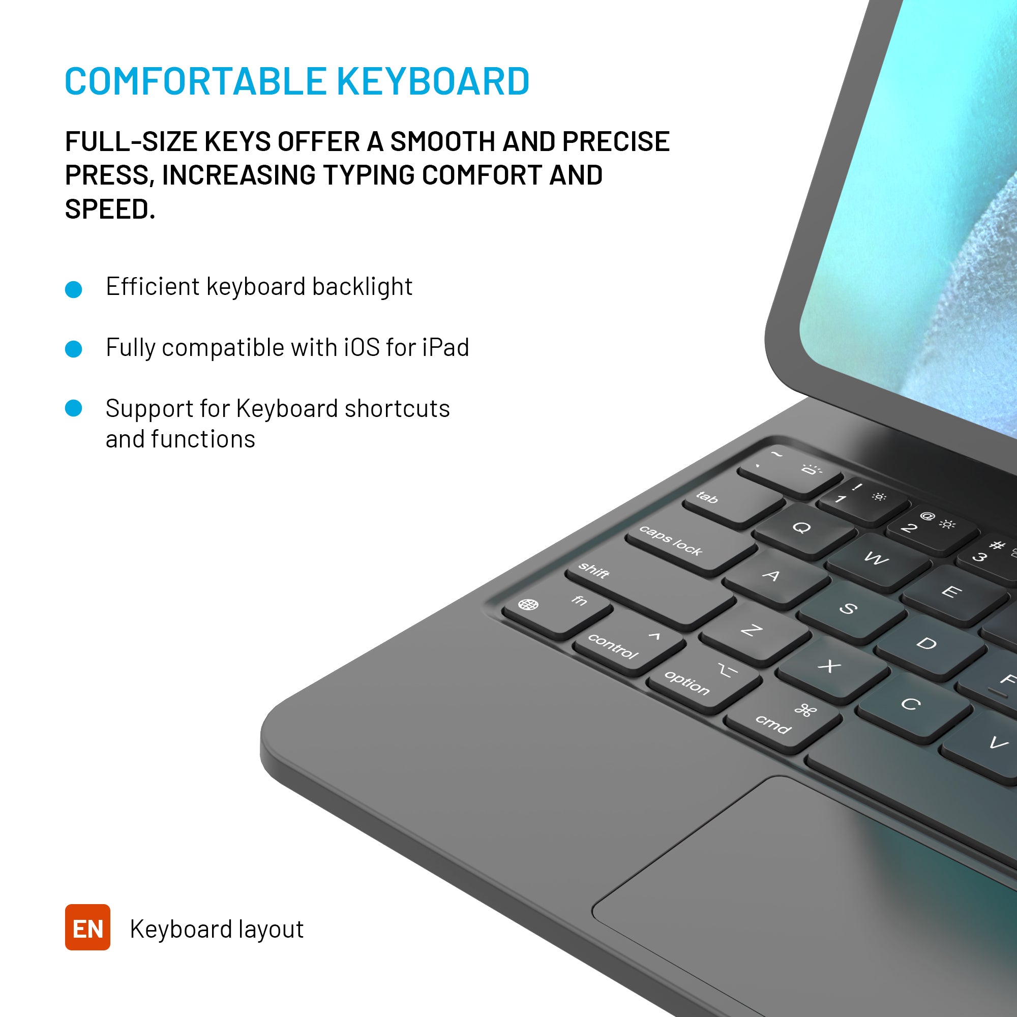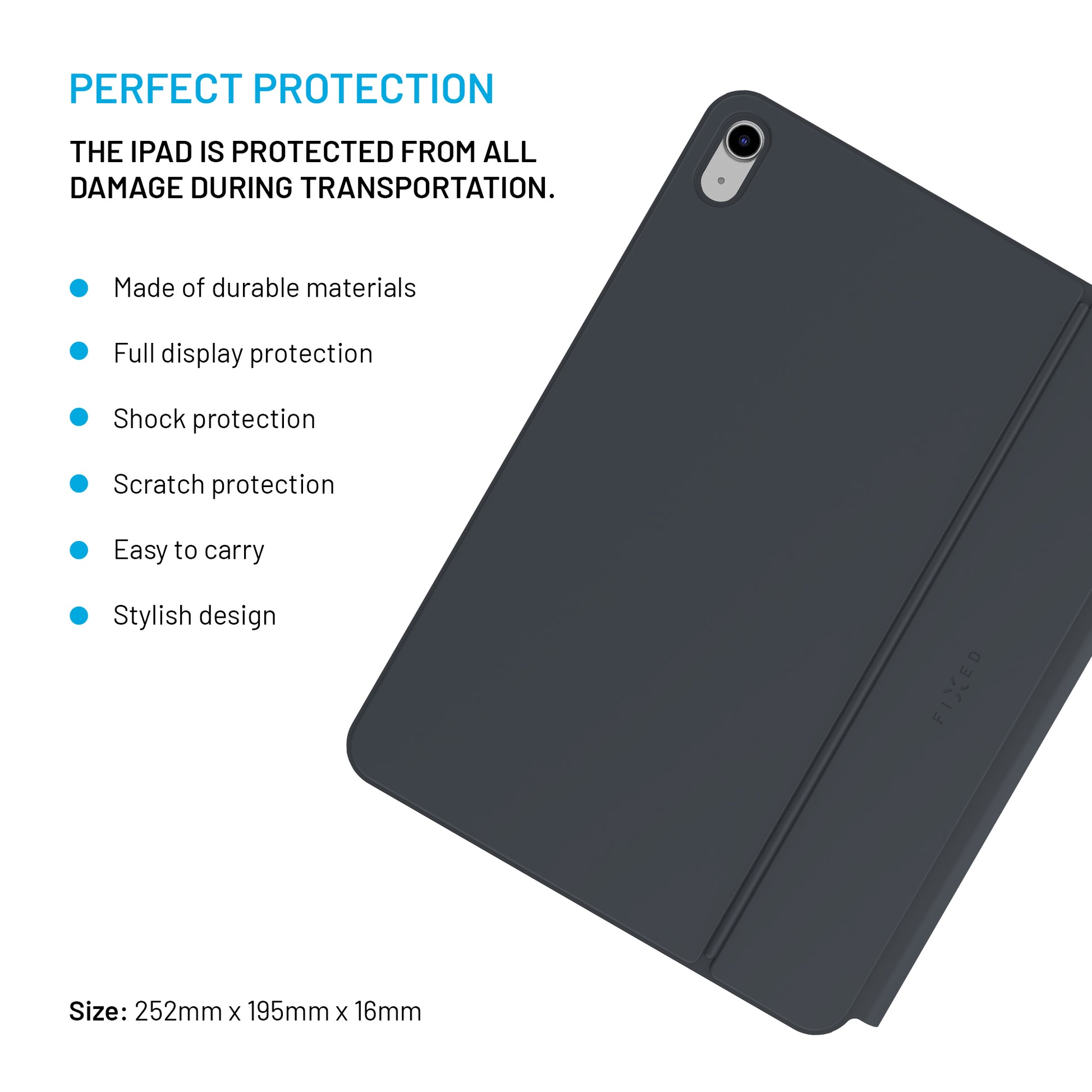 The FIXED Typee case combines a wireless keyboard and flawless trackpad together with protection for the iPad tablet. The keyboard features a five-point multi-touch trackpad and function keys that support iPadOS-specific gestures and keyboard shortcuts for a MacBook-like user experience. The tablet can be easily attached using magnets to the inside of the case, which ensures protection from all sides to the inserted device. Connecting to the keyboard via Bluetooth ensures convenient use. The case is made of high-quality and light materials that give the device a stylish look, but also provide reliable protection against scratches, bumps and other damage. The keyboard has a high battery life of up to 100 hours and can be easily recharged using a USB-C cable directly from the tablet. The adjustable tilt angle from 65° to 125° allows you to find the ideal position for work or watching movies. Other practical functions are the automatic sleep and wake mode and the information LCD display. The keyboard with English key layout is compatible with iPad 10"" (10th generation). The keyboard case turns your iPad into an even more powerful and versatile tool that will accompany you every step of the way.