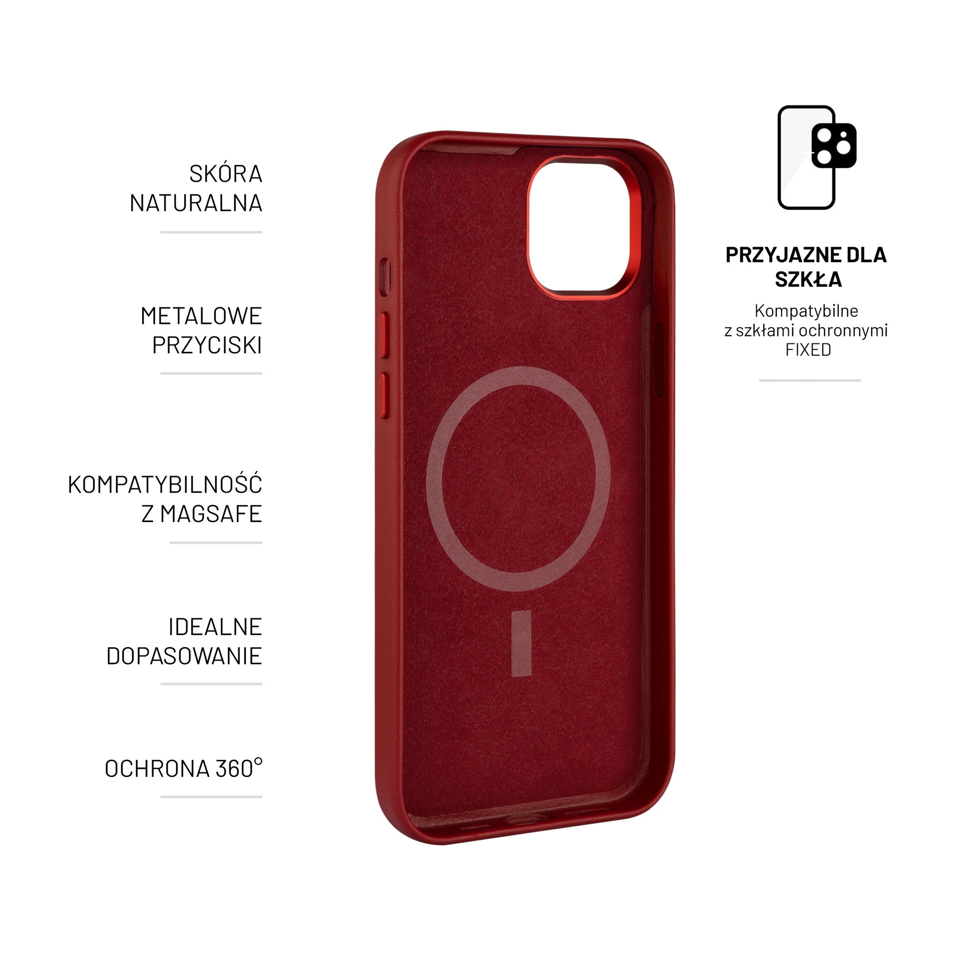 Tylna obudowa FIXED MagLeather z obsługą MagSafe, wykonana z prawdziwej skóry, zapewniająca doskonałą ochronę telefonu Apple iPhone. Etui już na pierwszy rzut oka zachwyca eleganckim wyglądem kolorowej skóry połączonej z metalicznymi nakładkami na przyciski i wykończeniem krawędzi wycięcia na aparat. Z czasem każdy pokrowiec nabiera unikalnej i oryginalnej patyny i starzeje się jak wino. Dzięki zintegrowanym magnesom z tyłu, pokrowiec MagLeather doskonale współpracuje ze wszystkimi akcesoriami MagSafe. Wewnątrz pokrowca znajduje się miękka podszewka z mikrofibry zapewniająca doskonałe bezpieczeństwo włożonego telefonu. FIXED MagLeather jest precyzyjnie dopasowany do modelu telefonu, idealnie pasuje i dobrze leży w dłoni.