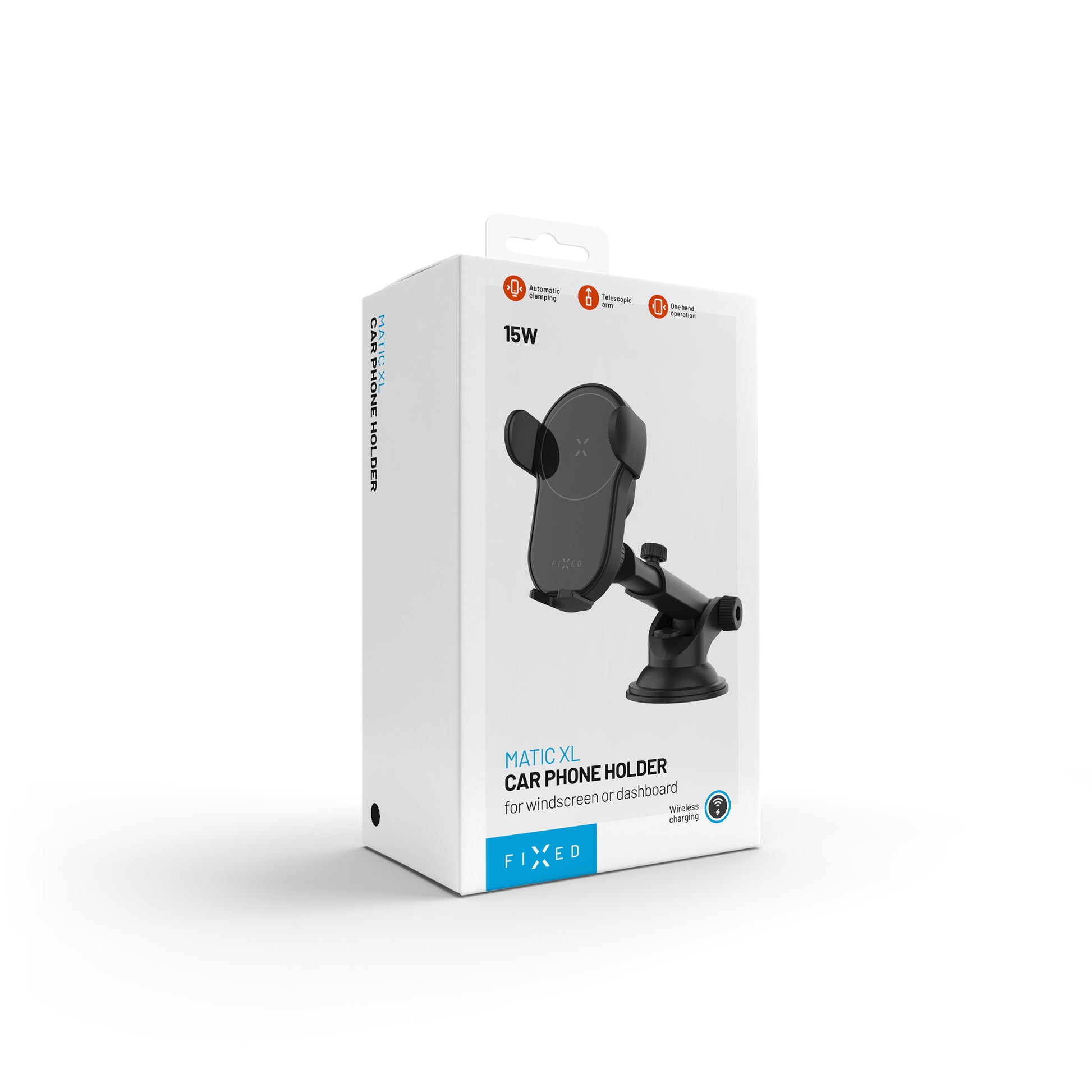 FIXED Matic XL predstavuje moderný držiak mobilného telefónu s rýchlym bezdrôtovým nabíjaním, automatickým zovretím klieští a výsuvným predĺženým ramenom. Je určený na uchytenie na palubnú dosku alebo čelné sklo pomocou prísavného podstavca. Po vložení telefónu sa okamžite spustí rýchle bezdrôtové nabíjanie s výkonom 15W s podporou Qualcomm Quick Charge 3.0. Rameno držiaka s nastaviteľnou dĺžkou je vhodné aj do dodávok a nákladných vozidiel. Pomocou otočného kĺbu si nastavíte telefón do ideálneho uhla tak, aby bol v prípade potreby pekne na očiach. S držiakom FIXED Matic bude vaša jazda s telefónom v aute pohodlnejšia a bezpečnejšia ako kedykoľvek predtým.