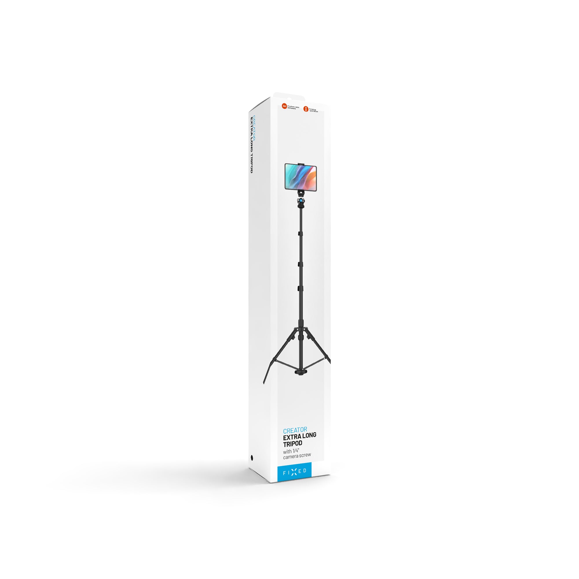 Statív FIXED Creator Tripod je ideálnou voľbou pre všetkých tvorcov obsahu, ktorí hľadajú spoľahlivého parťáka na fotenie či natáčanie videí. Univerzálny 1/4"" závit slúži na jednoduché pripevnenie fotoaparátu, akčné kamery alebo LED svetlá, zatiaľ čo držiak s posuvnými kliešťami bez problému pojme telefóny a tablety až do veľkosti 13"". Štvordielna konštrukcia statívu sa dá nastaviť do výšky až 190 cm a vybranú pozíciu bezpečne zaistíte praktickým uťahovacím mechanizmom. Pre presné nastavenie uhla slúži otočný kĺb, vďaka ktorému je možné zariadenie polohovať horizontálne aj vertikálne. Nohy statívu sa rozkladajú jediným kliknutím o zem, čo zaručuje rýchlu a pohodlnú prípravu na použitie. Odolná hliníková zliatina unesie záťaž až 5 kg a v zloženom stave má statív kompaktných 56 cm. Súčasťou balenia je aj praktický prepravný obal pre ľahký transport, vďaka ktorému môžete mať statív vždy po ruke.